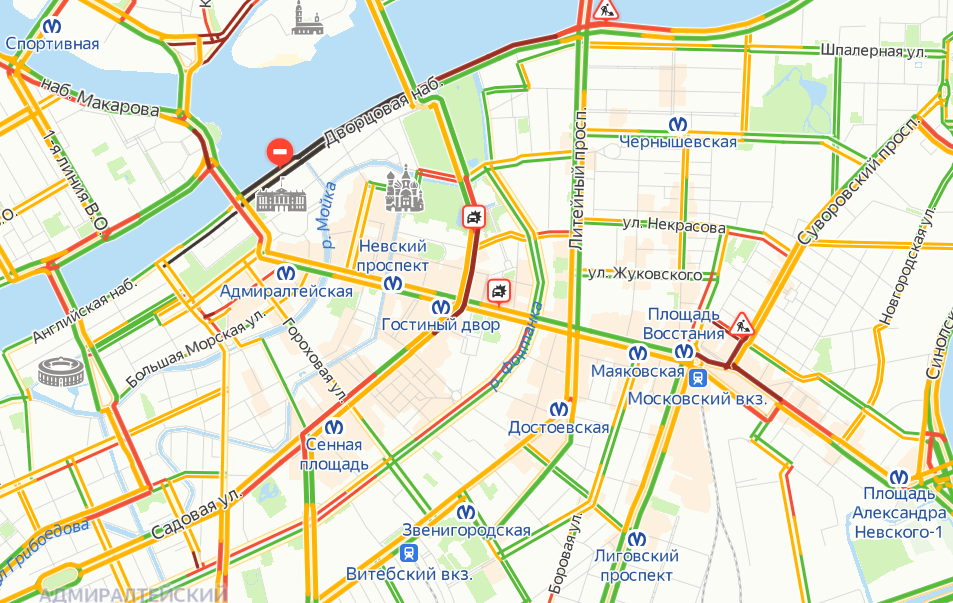 Утром 30 апреля в центре Петербурга образовались пробки, следует из данных сервиса «Яндекс.Карты».