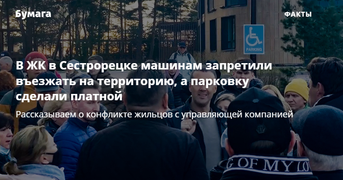 В ЖК «Светлый мир „Внутри“» в Сестрорецке жильцы уже месяц воюют с управляющей компанией. На одну из бесплатных парковок закрыли въезд и предложили собственникам арендовать места. Жильцы начали возмущаться — и в итоге на территорию запретили въезжать всем, кроме экстренных служб.