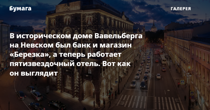 Дом Вавельберга в начале Невского проспекта был возведен в 1912 году по проекту архитектора Мариана Перетятковича в стиле неоренессанс. Здание построили в качестве офиса Санкт-Петербургского торгового банка, в советские годы там работал крупный антикварно-комиссионный магазин, а позднее — кассы «Аэрофлота» и магазин «Березка». В 2017 году дом начали реконструировать под гостиницу.