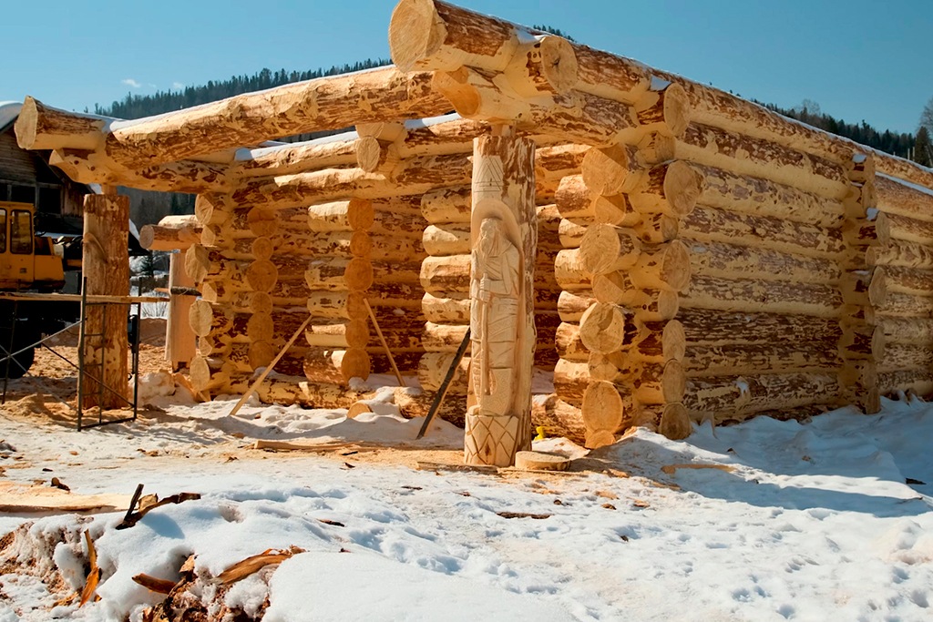 Киршин показывает на стены свежего сруба: «Колонны резные, видите? Если стены уже зашлифовали, то смола после этого никогда не выступает. Все чисто будет. Дерево мягкое, пластичное. Одно удовольствие с ним работать. Чувствуешь тепло. Солнце на пользу кедру, дерево „подзагорает“, приобретает красивый красноватый цвет. Поэтому кедр так ценят, используют для срубов, художественных промыслов, карандашей».