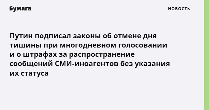 Президент России Владимир Путин подписал несколько законов, среди которых отмена дня тишины во время многодневного голосования и новые ограничения, связанные со СМИ-иноагентами. Документы опубликованы на портале правовой информации вечером 30 апреля.