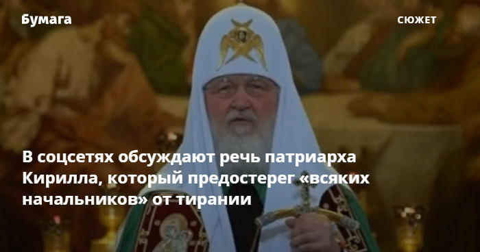 Патриарх Московский и всея Руси Кирилл выступил с речью об опасности тирании. Она прозвучала в предпасхальном выпуске «Слова пастыря» на «Первом канале». Пользователи соцсетей бурно отреагировали на выступление, посчитав его критикой российской власти, а СМИ назвали проповедь «либеральной». «Бумага» собрала реакцию на речь патриарха.