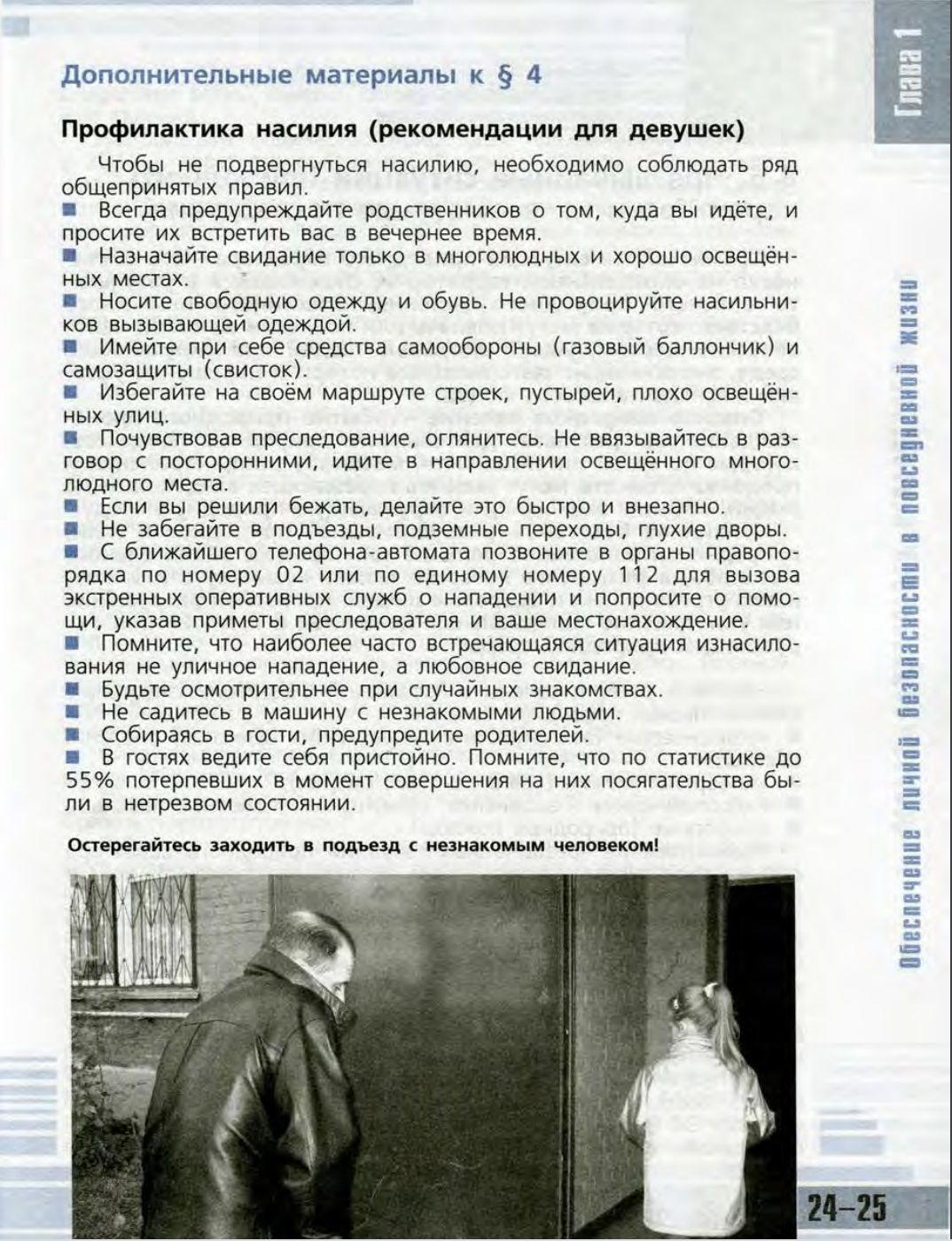 Другой учебник "Основы безопасности жизнедеятельности" Петрова, Смирнова, Фролова и еще нескольких авторов за 7-й класс содержит параграф, посвященный безопасности девочек-подростков (10.2). Начинается он с обвинения: "Ежедневно в городах происходит много трагедий с беззащитными девушками из-за их легкомыслия, незнания жизни".