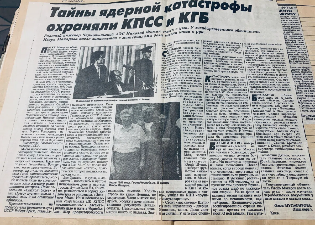 В июле 1997 года автор этой заметки опубликовала в «Комсомольской правде» материал «Тайны ядерной катастрофы охраняли КПСС и КГБ». Мой собеседник — в 1986 году прокурор республиканской прокуратуры Игорь Макаров — стал одним из действующих лиц известного «чернобыльского процесса» (суда над директором станции Брюхановым, главным инженером Фоминым, заместителем главного инженера по эксплуатации второй очереди Дятловым, начальником смены Рогожкиным, начальником реакторного центра Коваленко и инспектором Госатомэнергонадзора СССР Лаушкиным) не то чтобы случайно, но благодаря конъюнктуре.