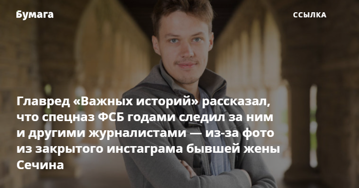 Главный редактор «Важных историй» Роман Анин рассказал, что «сечинский спецназ» ФСБ несколько лет следил за ним и другими журналистами из «Новой газеты», где он работал. Расследование опубликовано на сайте «Важных историй».