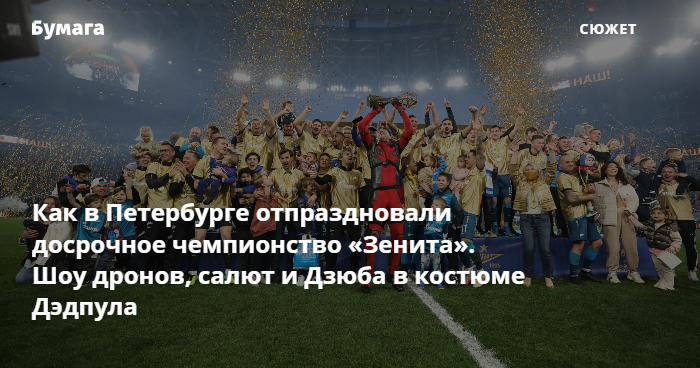 Вечером воскресенья «Зенит» досрочно стал чемпионом Российской премьер-лиги, обыграв московский «Локомотив» со счетом 6:1. Победу в Петербурге праздновали повсюду: болельщики ходили с кричалками по метро и улицам, во время шоу дронов вспомнили про футбол, а у «Газпром Арены» прогремел салют. Капитан «Зенита» Артем Дзюба и вовсе получал медаль в костюме Дэдпула.