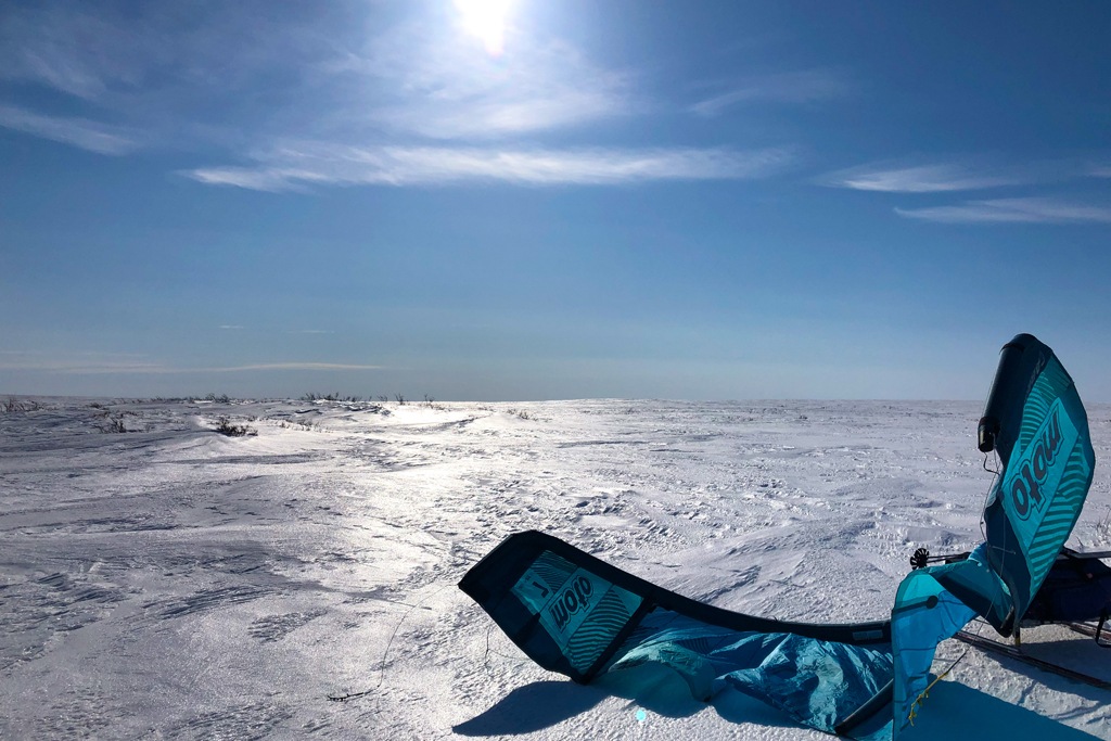 «Поскольку наш поход был на кайтах, мы всецело зависели от ветра. Если его нет — мы не едем. В тундре ветер, в сравнении с Обским водохранилищем, не такой предсказуемый и стабильный, — объясняет Полякова. — Погода в тундре зависит от водоразделов: когда ты пересекаешь озеро или холм, она меняется. Например, до холма у тебя ветер был 10 м/с, а за ним 3 м/с. Зная такую особенность, мы терпели сильный ветер и высокую скорость, чтобы продвинуться дальше. А еще там озера и реки с высокими берегами — в низине ветра не хватает. Сани со снаряжением тяжелые — 130−140 килограммов. И нужен хороший ветер, чтобы поднять в гору вес человека и саней».