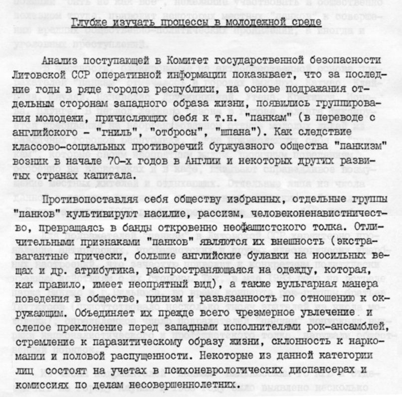 Какое дело военной контрразведке до панков? Товарищ майор сам лишь недавно о них услышал — первые последователи западной субкультуры в СССР появились на рубеже 70-80-х прошлого века. Массовостью новое молодежное увлечение не отличалось — но, судя по сообщениям КГБ 1982-1983 годов, спецслужба восприняла его всерьез как очередной продукт «идеологической диверсии империалистических государства».