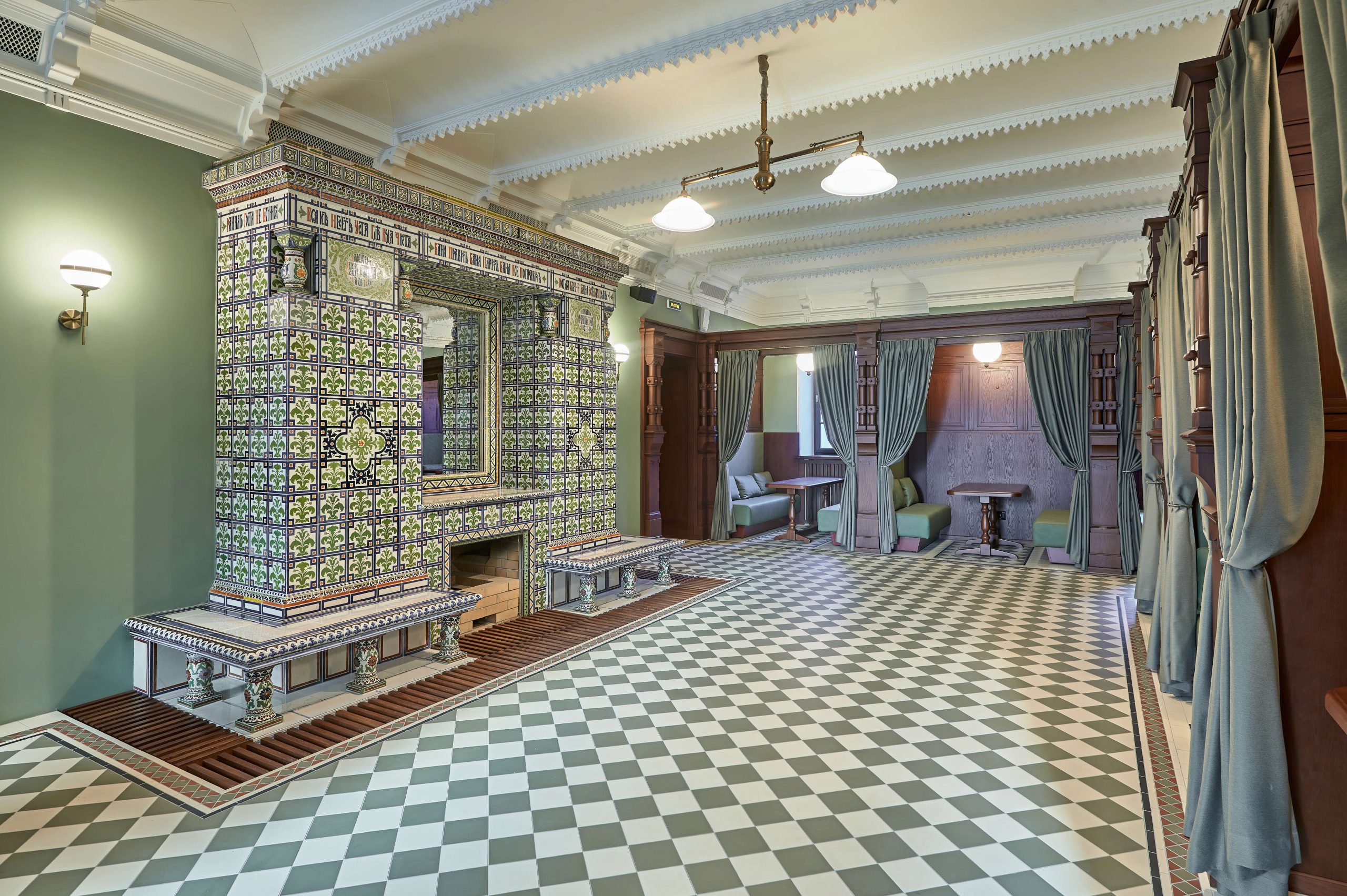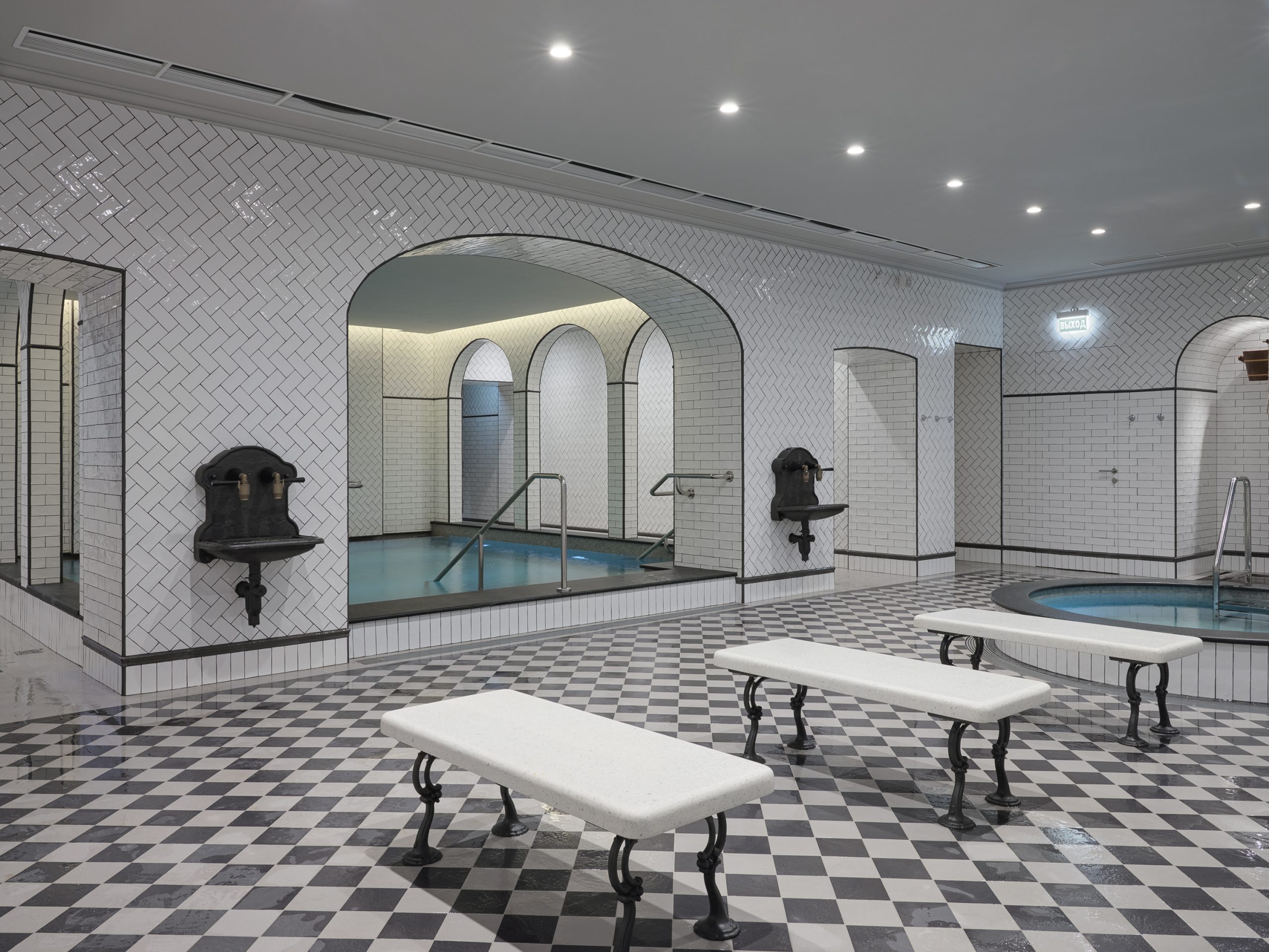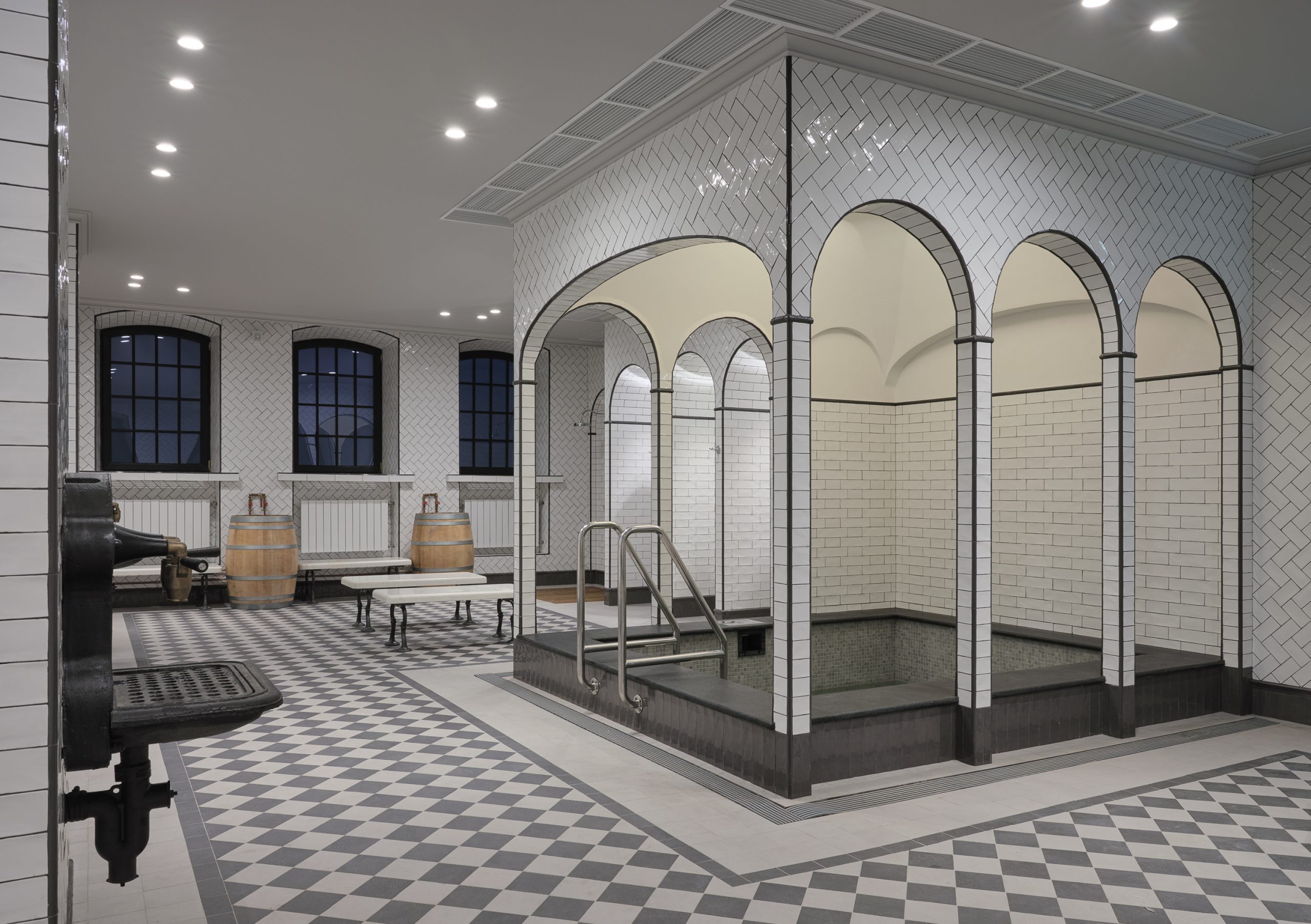 Другие элементы интерьера воссоздавали по старым фотографиям и гравюрам — например, бронзовую фигуру тритона в мужском бассейне, изразцовый камин в комнате отдыха или антикварный фальшкамин. При этом весь интерьер в целом выглядит очень современным.
