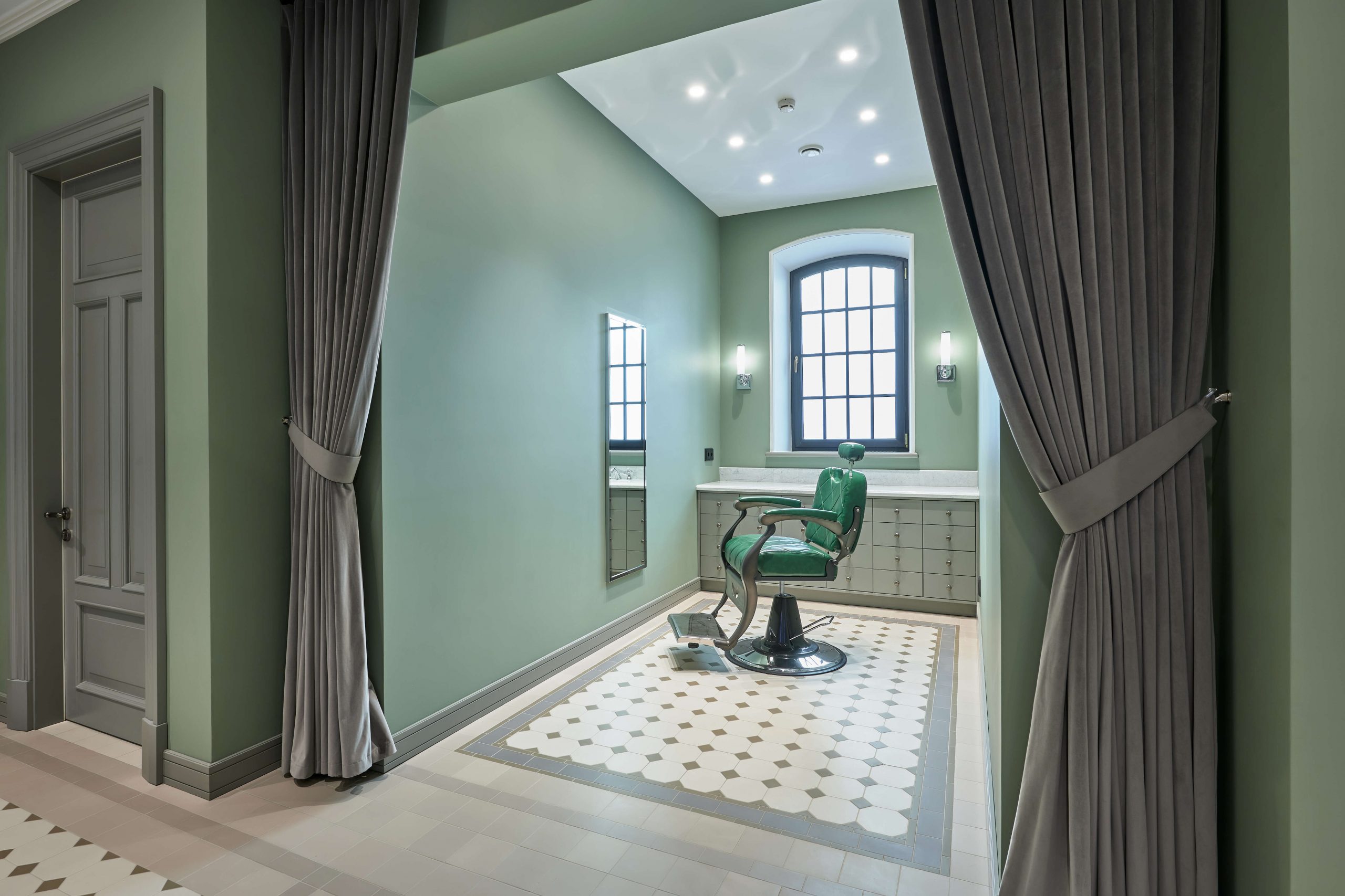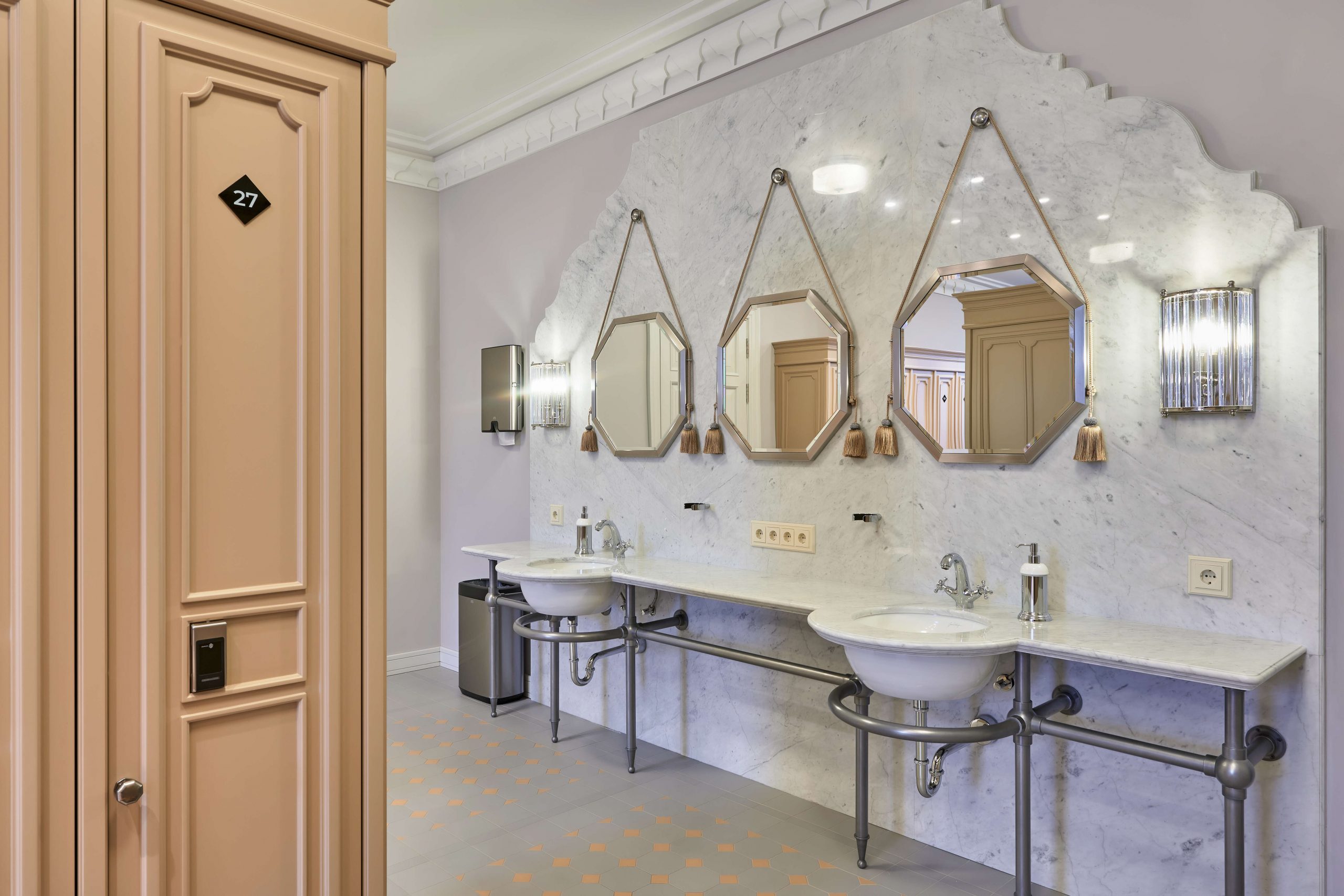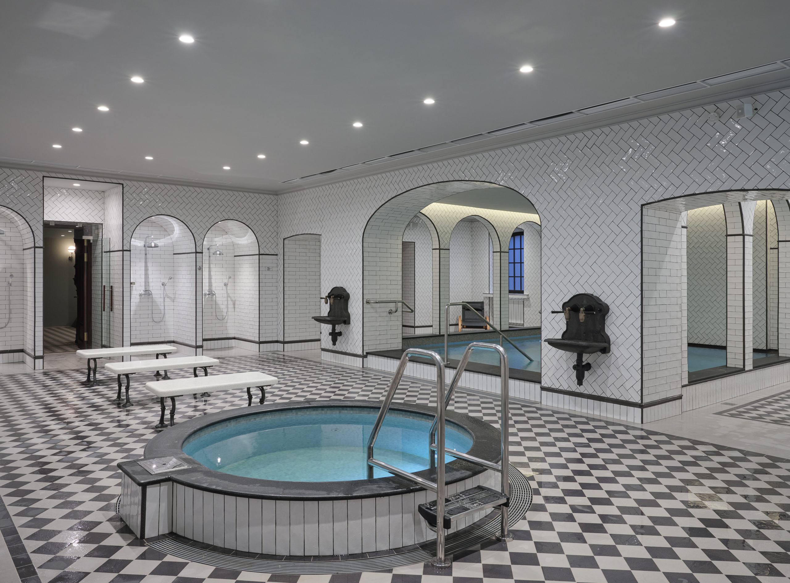 Другие элементы интерьера воссоздавали по старым фотографиям и гравюрам — например, бронзовую фигуру тритона в мужском бассейне, изразцовый камин в комнате отдыха или антикварный фальшкамин. При этом весь интерьер в целом выглядит очень современным.