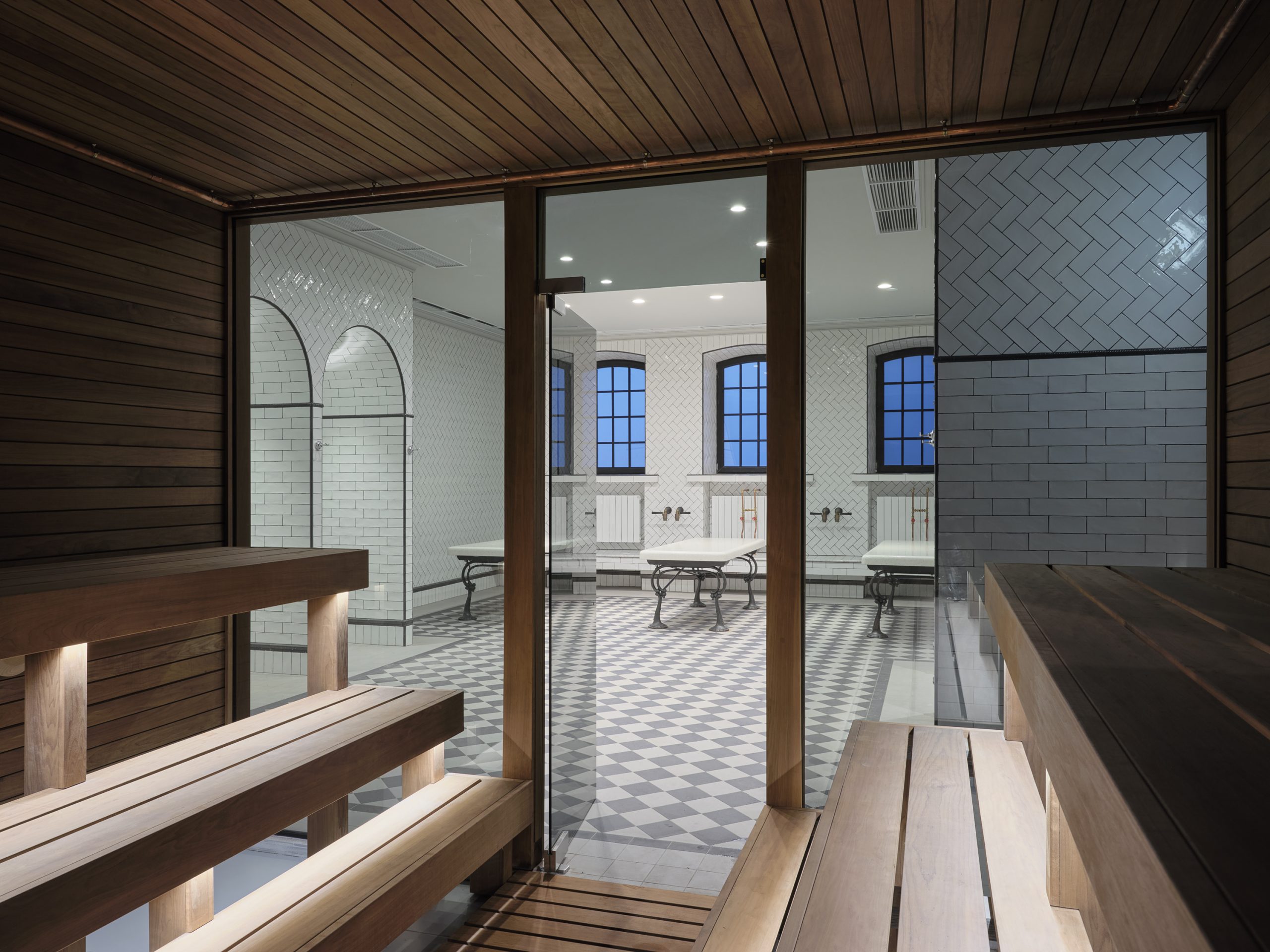 Перезапуск комплекса еще продолжается, поэтому пока не работает, например, буфет в зоне ресепшен. Но мужской и женский классы уже функционируют: там организовали массажные кабинеты, зоны отдыха, приватные кабины, бассейны, сауну, хаммам, купели и, конечно, парные. Парадоксально, но в женском классе русская парная больше, чем в мужском — обычно всё ровно наоборот. Такое решение продиктовано желанием сохранить оригинальную планировку.