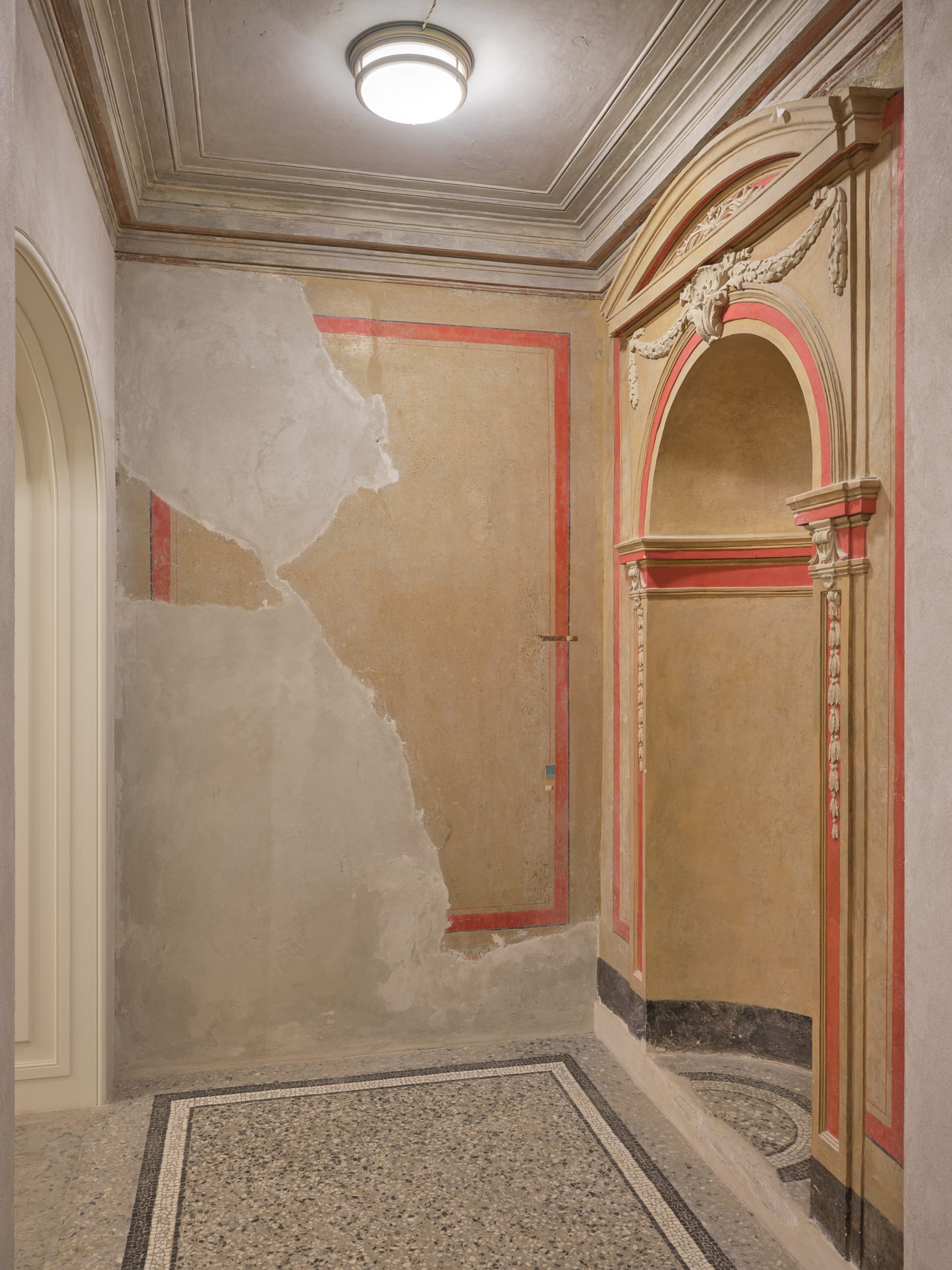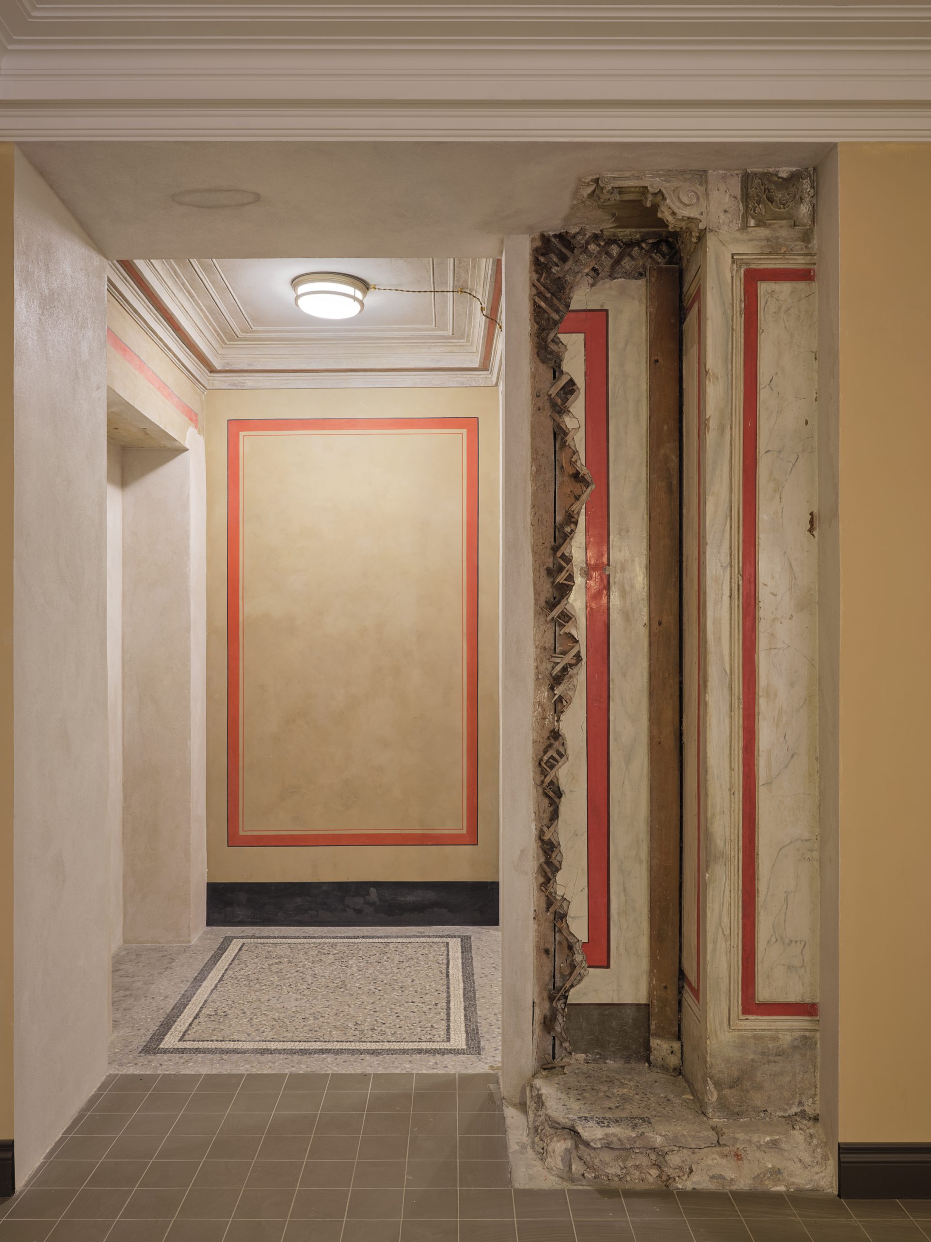 Отдельные исторические интерьеры сохранились: гости могут увидеть подлинные скульптуры атлантов, балки на потолках и раковины у бассейнов. На стене в будущей сувенирной лавке оставили несколько старых «культурных слоев» — от дореволюционного до советского. Сейчас эта часть недоступна для гостей, но после открытия лавки все желающие смогут осмотреть следы разных эпох.
