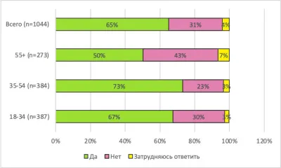 Во-первых, молодежь реже людей среднего возраста вступает в сексуальные отношения. Так, среди респондентов младше 35 лет о наличии сексуальных отношений за последний месяц высказались 67%, среди людей среднего возраста, от 35 до 55 лет включительно — 73% (рис. 1). Месячная сексуальная аудитория в старших возрастах, от 56 до 70 лет — 50%, что не катастрофически меньше, чем у молодежи.