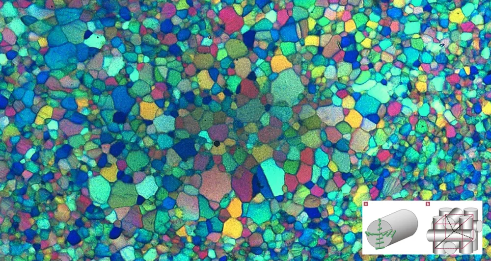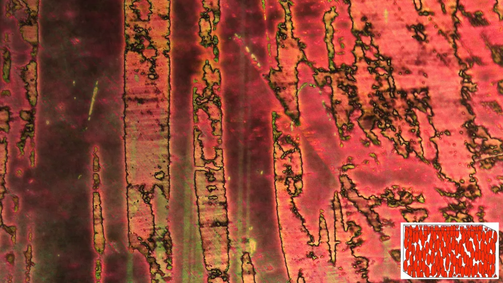 В 1995 году мне удалось обнаружить для ЖК-полимеров так называемые голубые фазы с красивой мозаичной текстурой (рис. 4). Пришлось потратить много сил для того, чтобы их обнаружить, так как они образуются в небольшом температурном интервале — меньше градуса. Но, как выяснилось, если образец охладить до температуры ниже температуры стеклования, то есть, например, до комнатной, то можно на десятилетия зафиксировать текстуру. Так, образец на рис. 4 хранится без изменений уже больше 25 лет! Это, к слову сказать, важное преимущество ЖК-полимеров по сравнению с «обычными» жидкими кристаллами — сохранять свою структуру и оптические свойства в «замороженном» стеклообразном состоянии.
