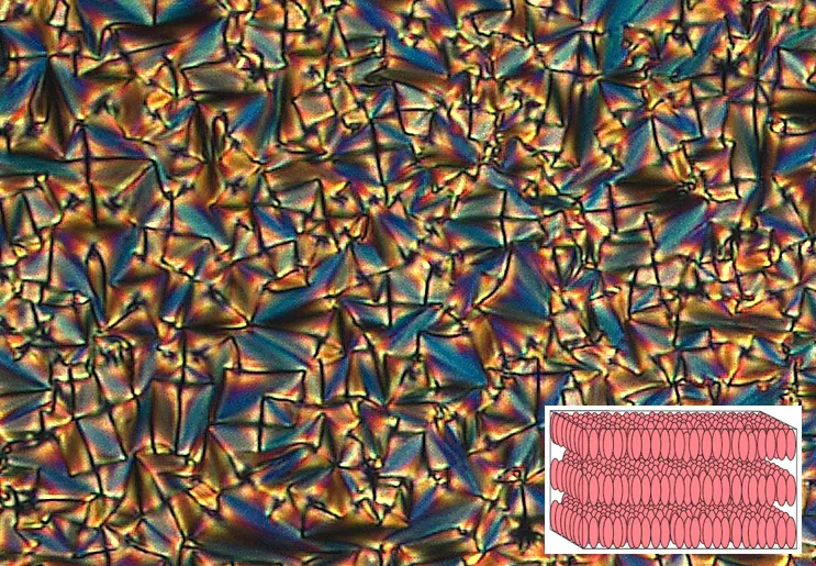 Смектические фазы, в которых, кроме ориентационного порядка, формируется слоевая упаковка молекул, чаще всего формируют конфокальные, или «веерные» текстуры (рис. 2).
