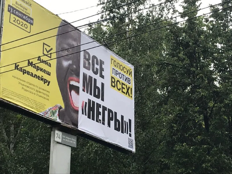 Куда более масштабной оказалась кампания в ульяновскую гордуму в 2020 году. Перед днем голосования в Ульяновске появилось провокационное движение «Против всех». Во время кампании лидер движения Анна Карвалейру устраивала перформансы (к примеру, вышла к памятнику Карлу Марксу с плакатом «Чищу совесть» и предлагала всем желающим почистить обувь), а также позировала для агитационных плакатов с лозунгами «Все мы негры! Голосуй против всех», «Мы не рабы!» Для драматизма лицо мулатки Карвалейру на плакатах было намазано черной краской. Из-за провокационной агитации девушку даже обвинили в блэкфейсе (нанесение грима для карикатурного изображения чернокожих. — Ред.) и хотели снять с выборов, однако суд посчитал доводы обвинения неправомерными, потому что Анна Карвалейру сама является представителем африканской культуры, а слово «негры» в агитации носит социальный подтекст.