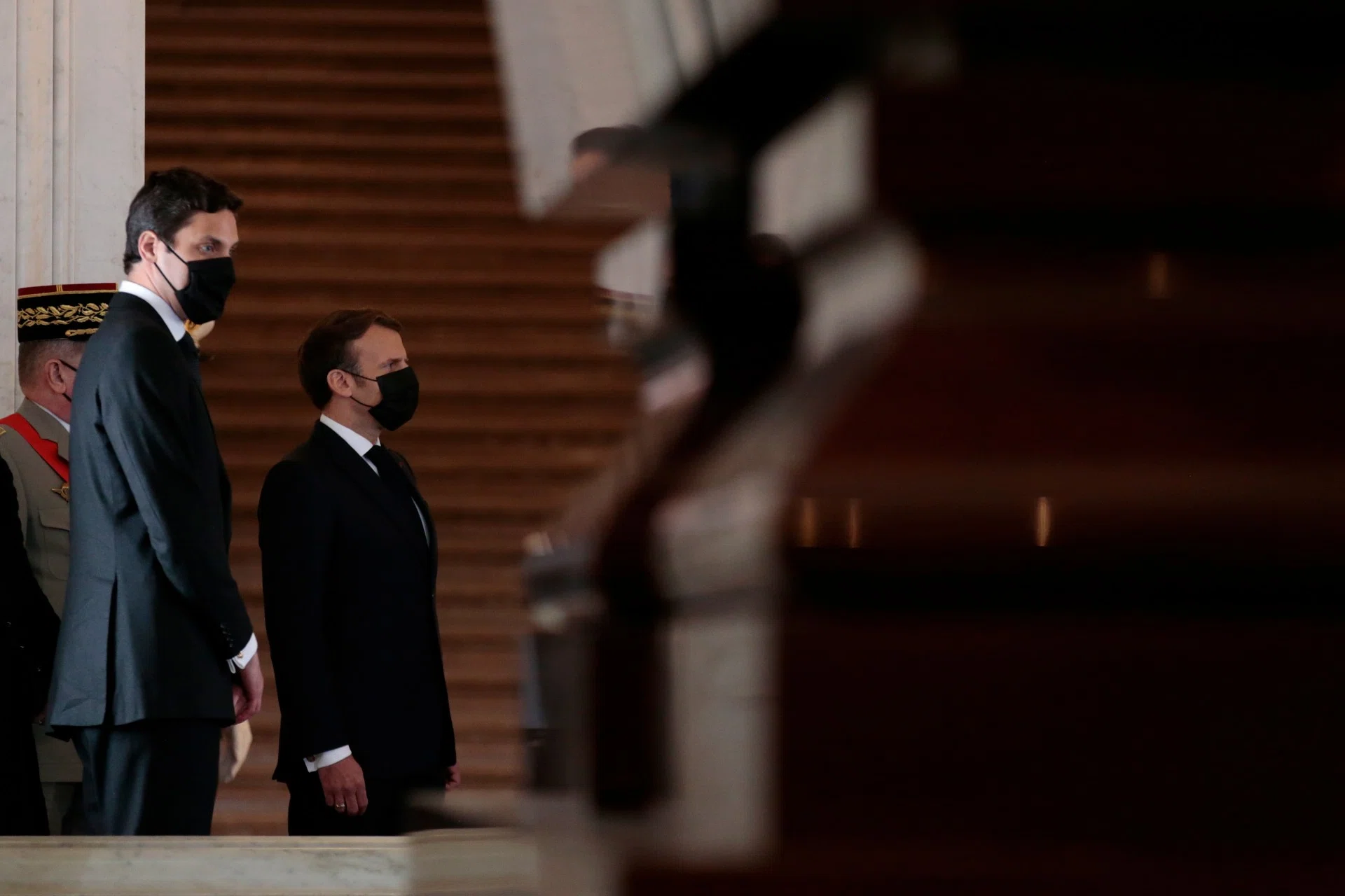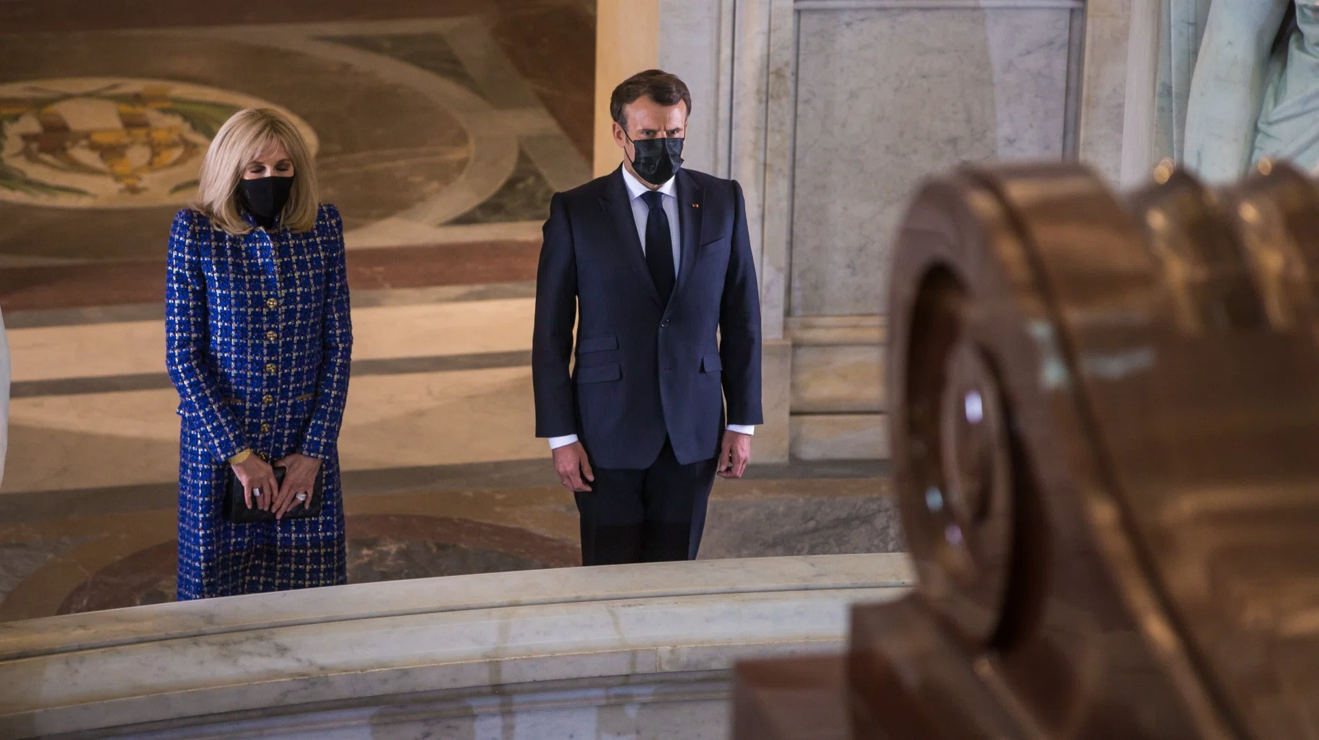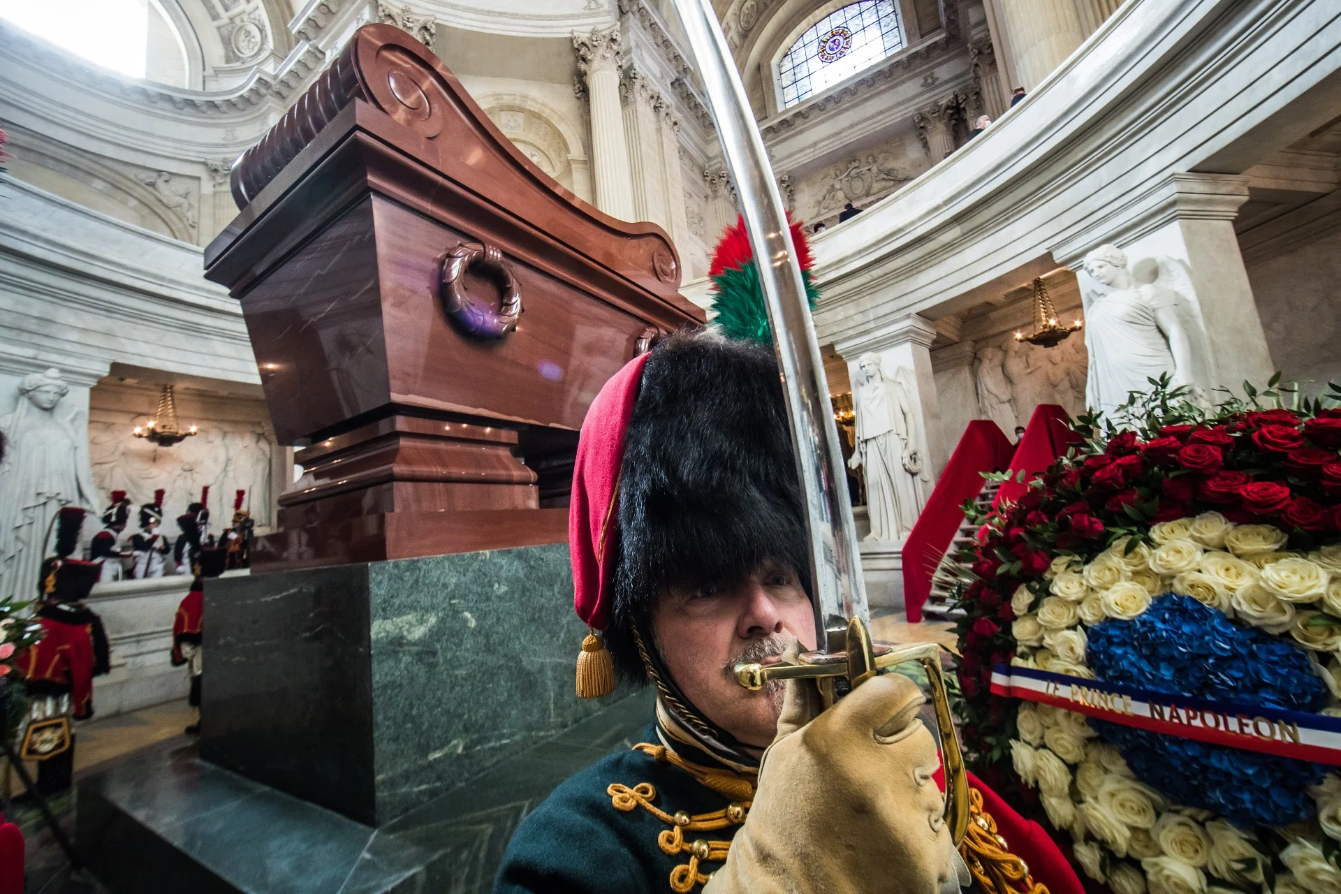 В Доме инвалидов, у гробницы Наполеона, президента Макрона (с супругой Брижит) встречали: министр обороны Флоранс Парли, начальник Генштаба Франции Франсуа Лекуантр; военный губернатор Парижа генерал Кристоф Абад; ординарий Вооруженных сил Франции епископ Антуан Романе де Бон; его превосходительство Жан-Кристоф Наполеон…