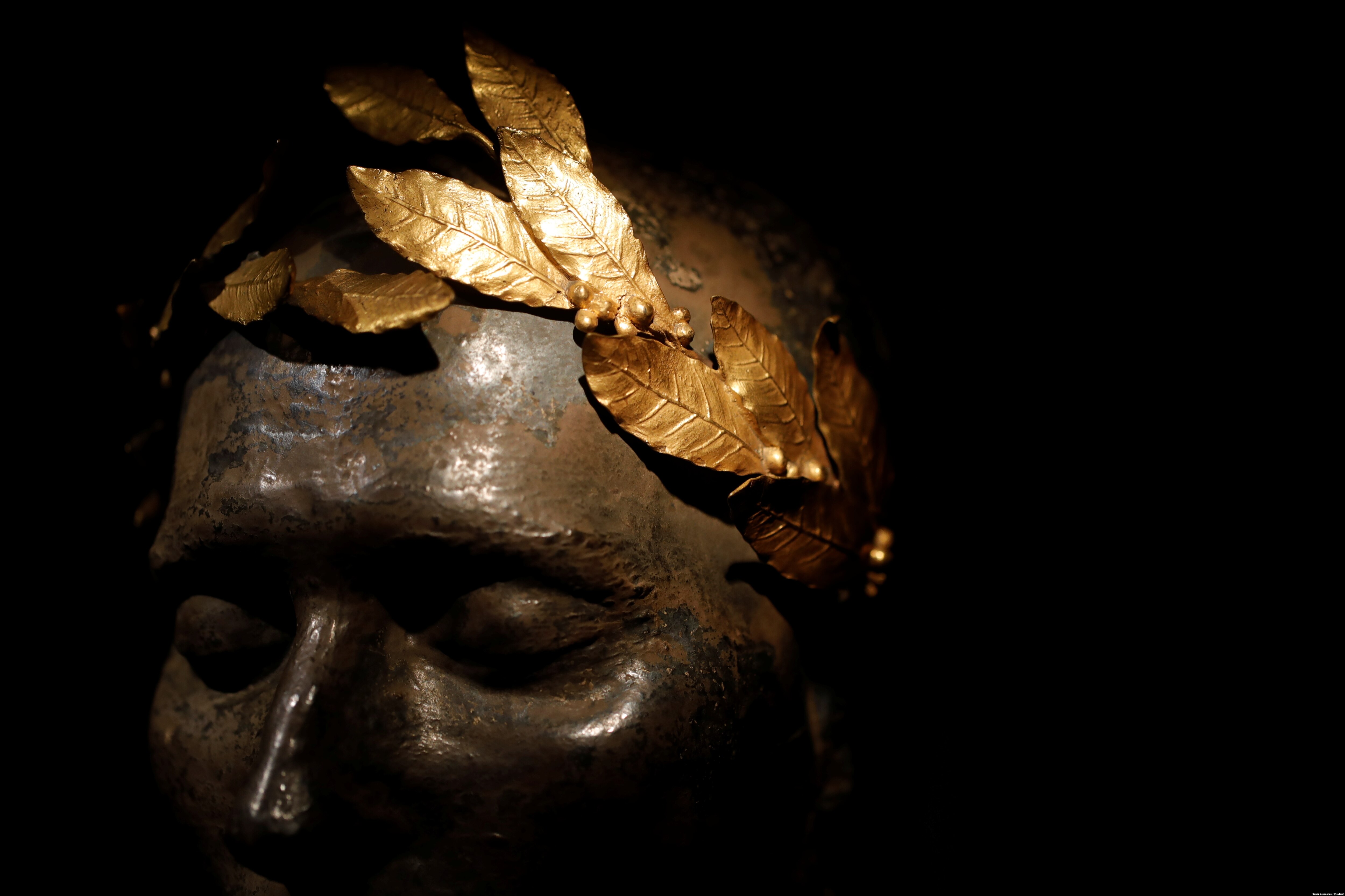Посмертная маска Наполеона, увенчанная золотым лавровым венком и выставленная в Музее французской армии в Париже
