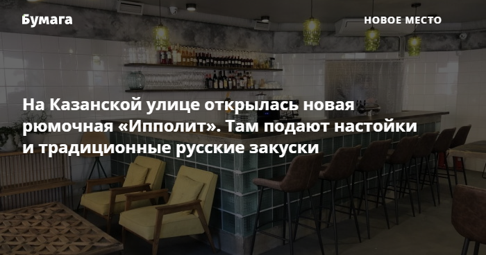 На Казанской улице в Петербурге открылась новая рюмочная «Ипполит». Заведение позиционирует себя как место «интеллигентной культуры потребления» и специализируется на настойках и традиционных русских закусках.
