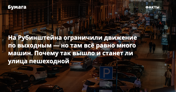 В октябре улица Рубинштейна должна была стать пешеходной в ночное время, но этого не произошло — машины продолжали ездить, несмотря на установленные знаки дорожного движения. По наблюдениям очевидцев, количество автомобилей не снизилось по сравнению с прошлыми неделями. «Бумага» собрала мнения жителей улицы, муниципальных депутатов и рестораторов о том, почему эксперимент не сработал и нужна ли эта мера вообще.