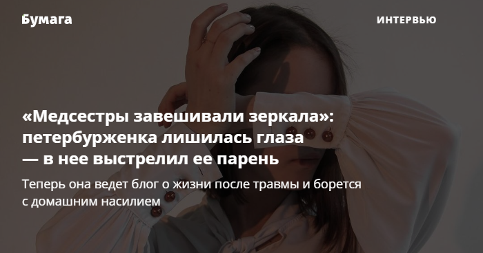 Дарья лишилась глаза и перенесла несколько операций. Девушка говорит, что побои были и раньше: в больнице на ее теле обнаружили множество синяков. Сейчас она ведет блог «Одноглазая красотка», в котором рассказывает о жизни после травмы. Дарья также получает юридическое образование и планирует помогать другим пережившим домашнее насилие. «Бумага» с ней поговорила.