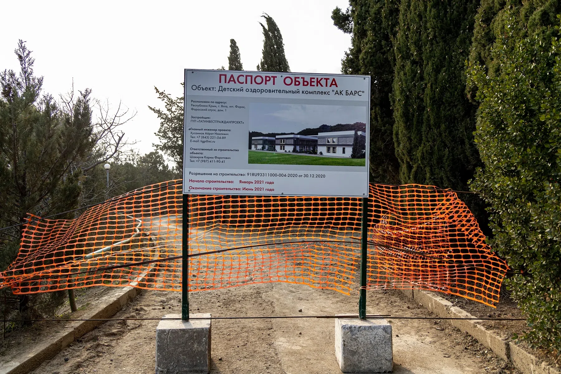 Стройку в Форосском парке ведет казанское ГУП «Татинвестгражданпроект». На территории ООПТ планируется возвести детский лагерь «Ак Барс», состоящий из восьмиэтажного жилого корпуса, трехэтажного административно-жилого корпуса, четырехэтажного спорткомплекса, бассейна, трехэтажной столовой, нового футбольного поля, сцены-амфитеатра, волейбольной площадки и ряда подсобных помещений.В 2016 году санаторий «Форос», расположенный по соседству с лагерем, выкупила за 1,4 млрд рублей Федерация профсоюзов Республики Татарстан. Впоследствии председатель Федерации Татьяна Водопьянова объясняла, что фактическим приобретателем стала корпорация «Татнефть», которой принадлежит хоккейный клуб «Ак Барс».