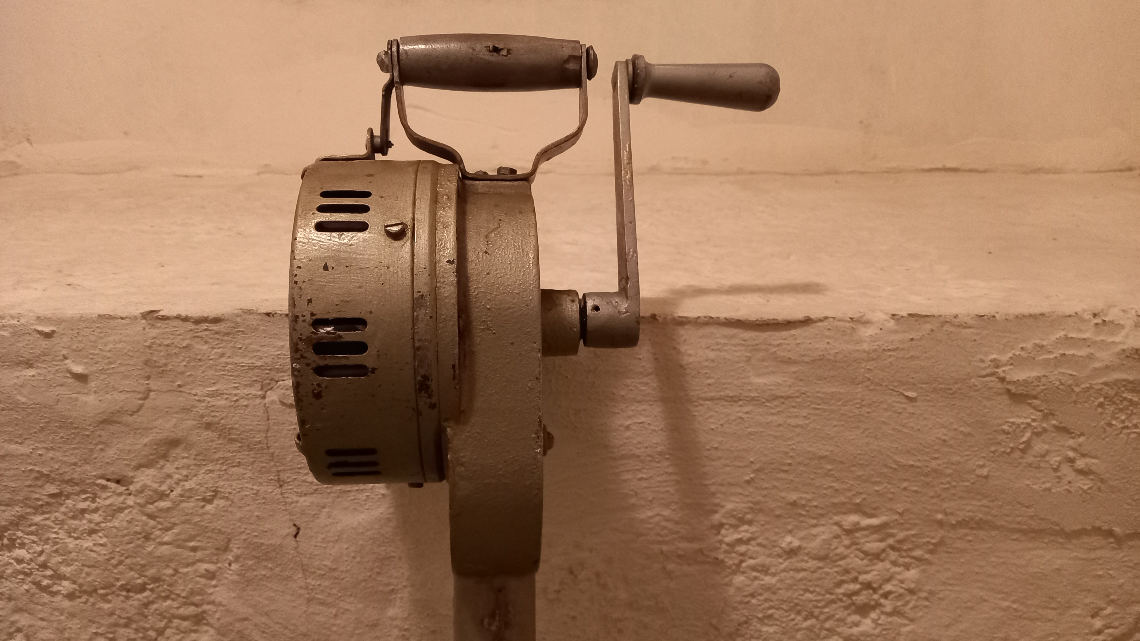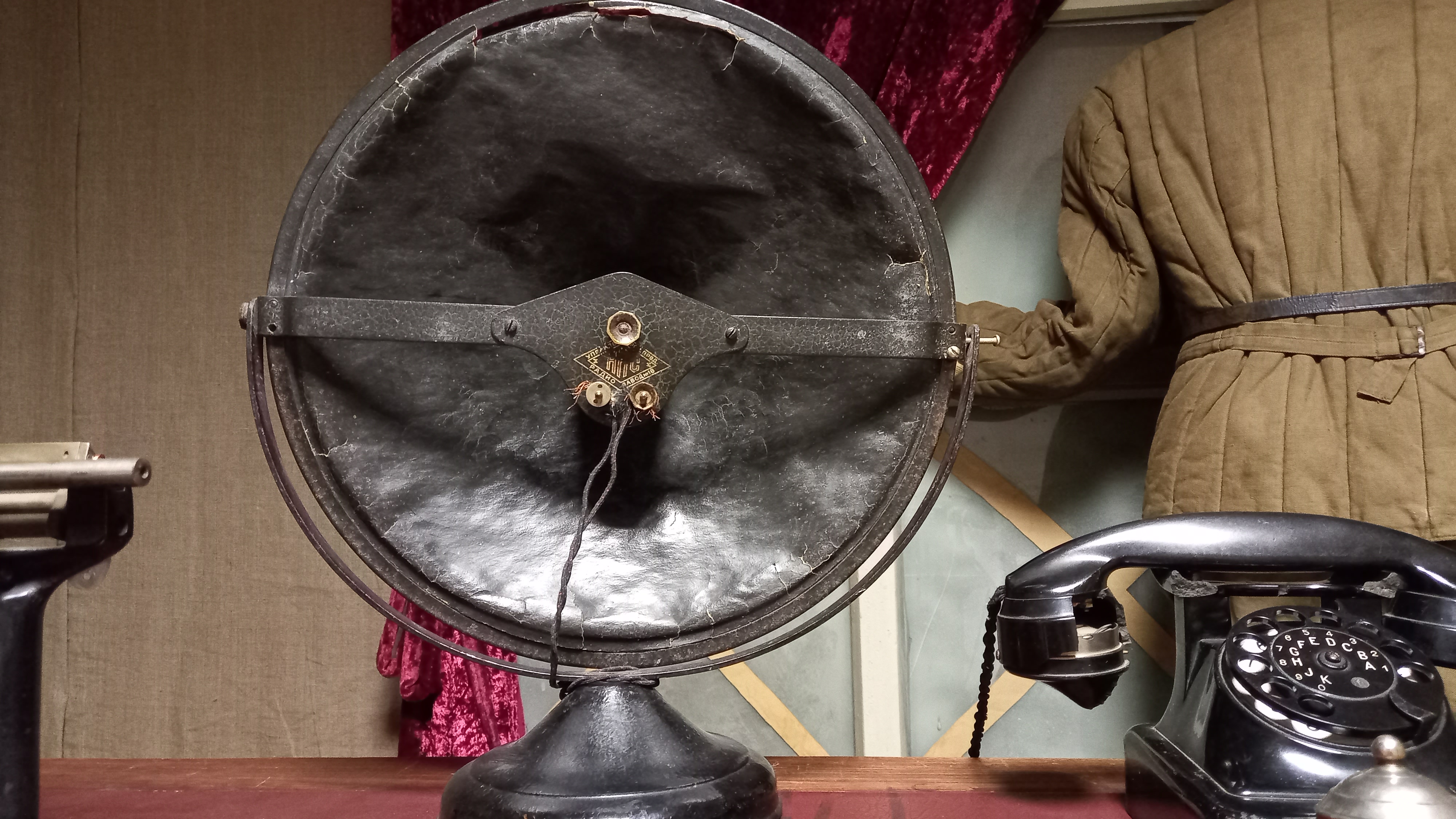 Артефакты самые разные – от черных радиотарелок и уникальных микрофонов того времени, которых нет больше нигде, до щипцов, которыми дежурившие на крышах блокадного города хватали зажигательные бомбы, "зажигалки", чтобы затем погасить. Такие щипцы прислонены к стене музея – оказывается, ручки у них очень длинные, больше метра. Рядом со щипцами – желтый, полуслепой газетный лист.