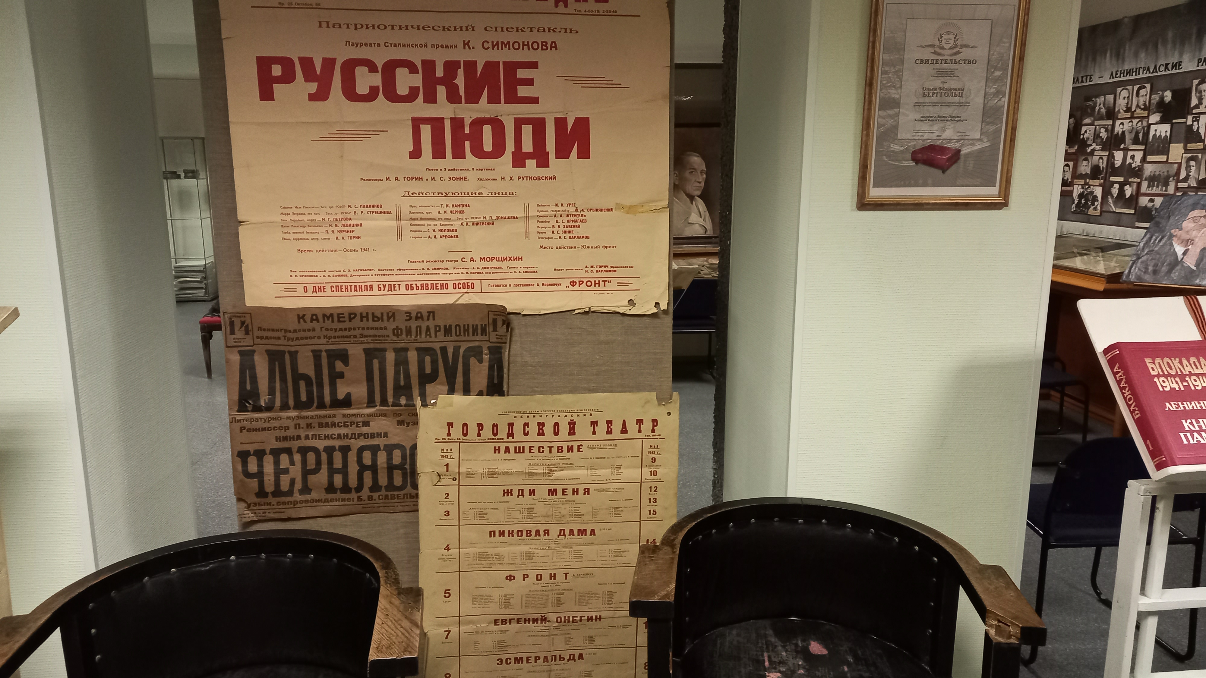 Напротив висят уникальные афиши 1942–1943 года. Программа диктора Нины Чернявской по "Алым парусам" Александра Грина в камерном зале филармонии. "Русские люди" – спектакль, с которого начался блокадный театр, родившийся из радиоспектакля по пьесе Константина Симонова; "Жди меня", "Пиковая дама".
