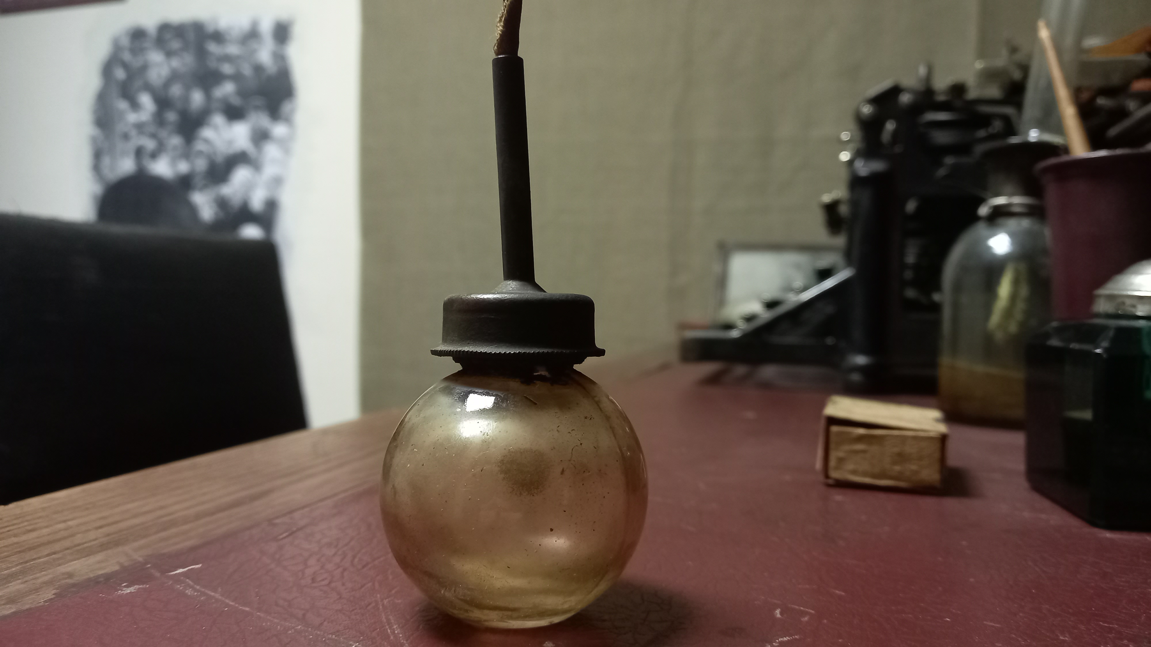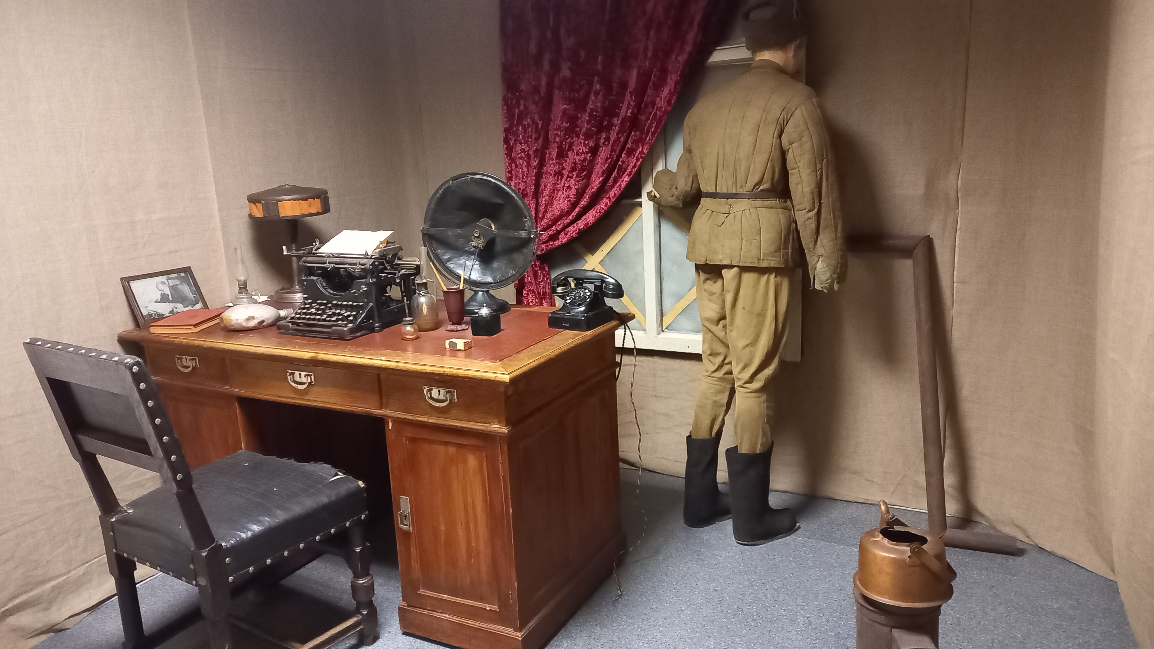 "Кабинет редактора" в маленькой комнате: письменный стол с пишущей машинкой, рукописи, спички, коптилки, крошечные керосиновые лампы – электричество в Дом Радио давалось только на время вещания, вечерами работали в темноте. Коптилка – крошечная баночка, куда наливалось что-нибудь горючее, и фитилек. Правда, самого популярного варианта, из гильзы, тут нет.