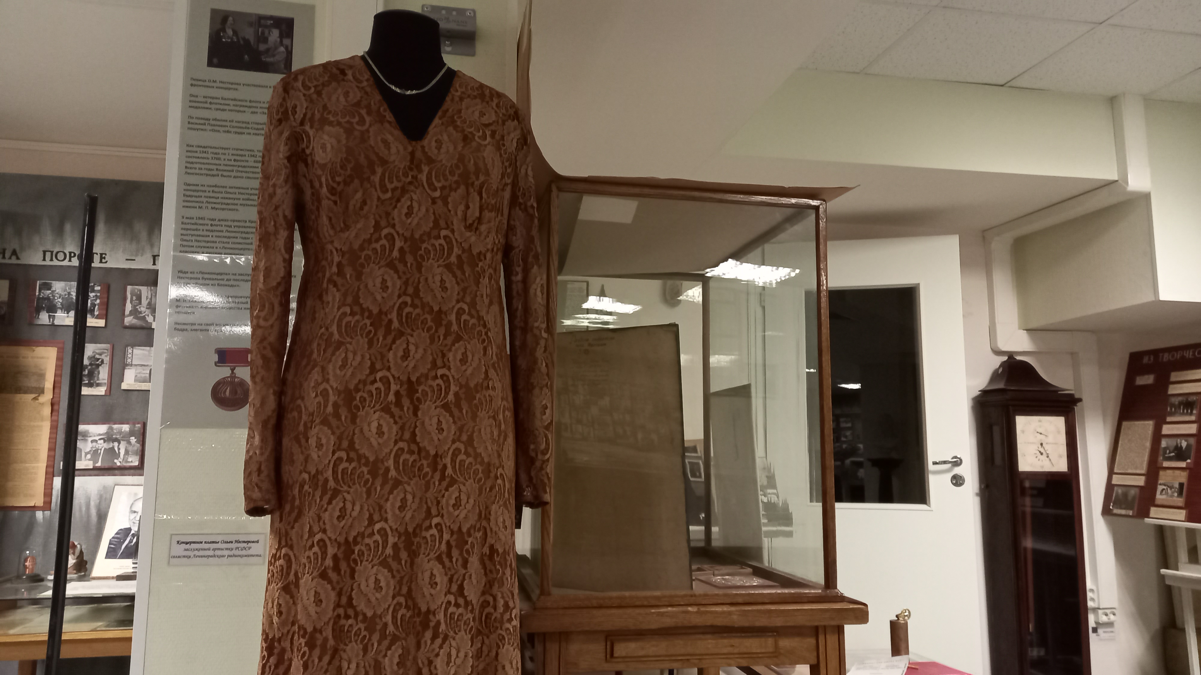 – Залы были полны, это была естественная тяга людей – отвлечься, увидеть что-то, не всегда напрямую связанное с войной. Вот тут у нас еще платье концертное, нам его передала заслуженная артистка РСФСР Ольга Нестерова, это была такая ленинградская Шульженко, хотя голос у нее был, конечно, другой, своеобразный, и она была больше вокалистка, чем Шульженко. Она дала на фронте больше 3000 концертов, очень красивая женщина была, а умерла, когда ей было хорошо за 90, так что еще лет 6–7 назад она тут бывала, записывала, рассказывала.