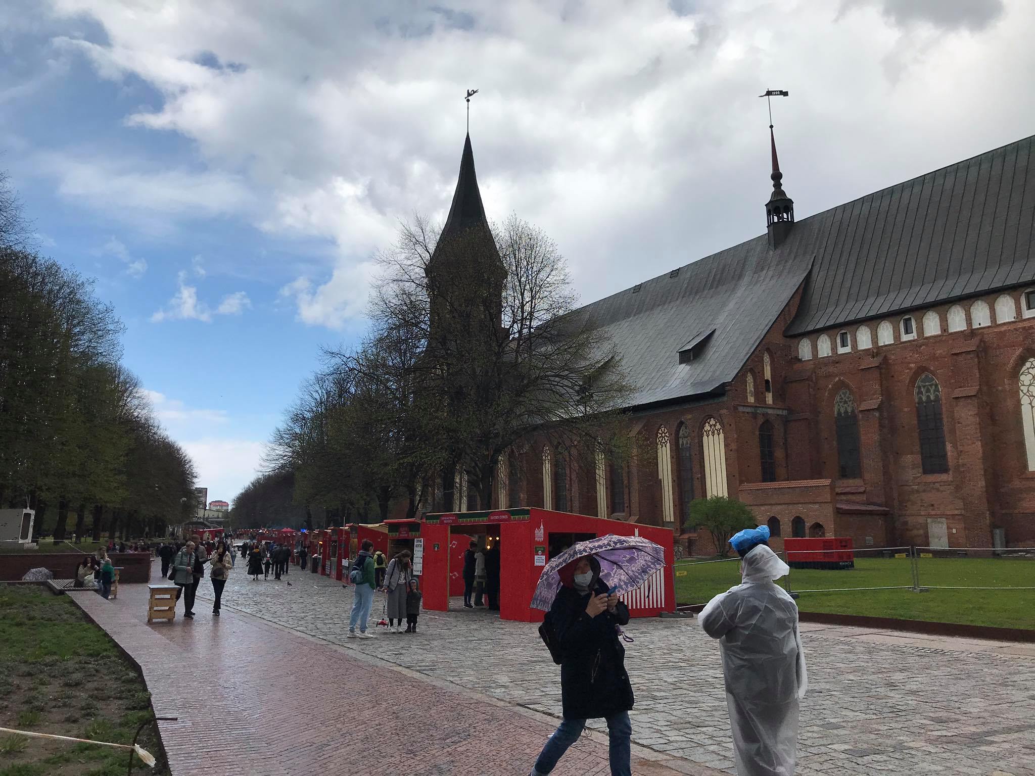 Они, как и сотни гостей города, гуляют в историческом центре, на острове Канта. На майские праздники в Калининграде ухудшилась погода, теплые весенние дни сменились дождем и ветром. Но гуляющих все равно много.