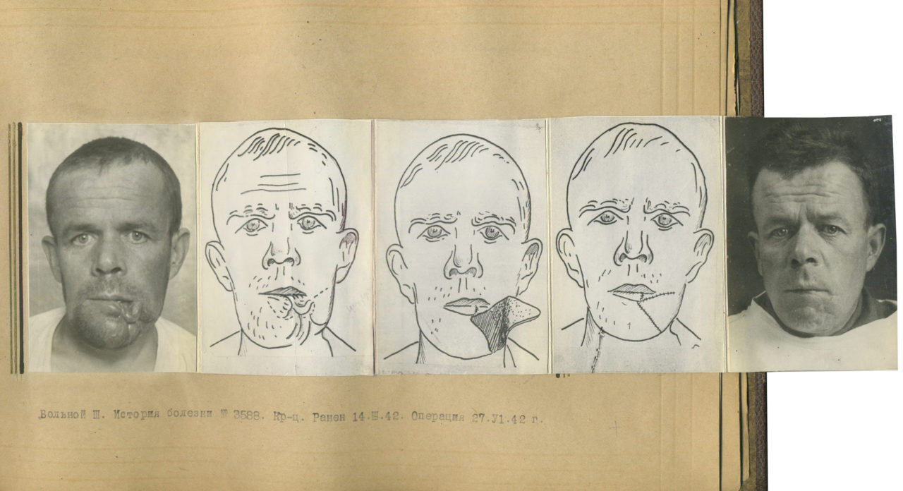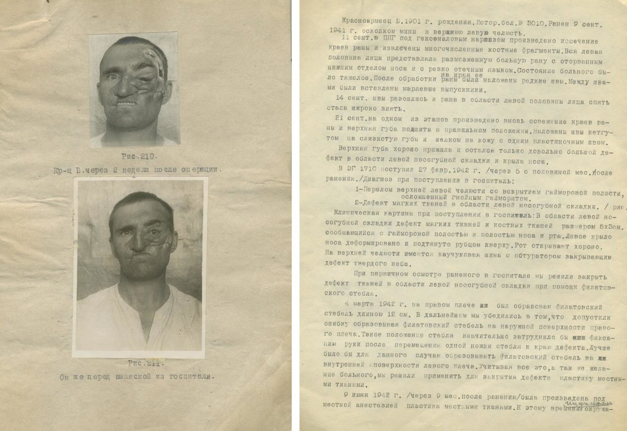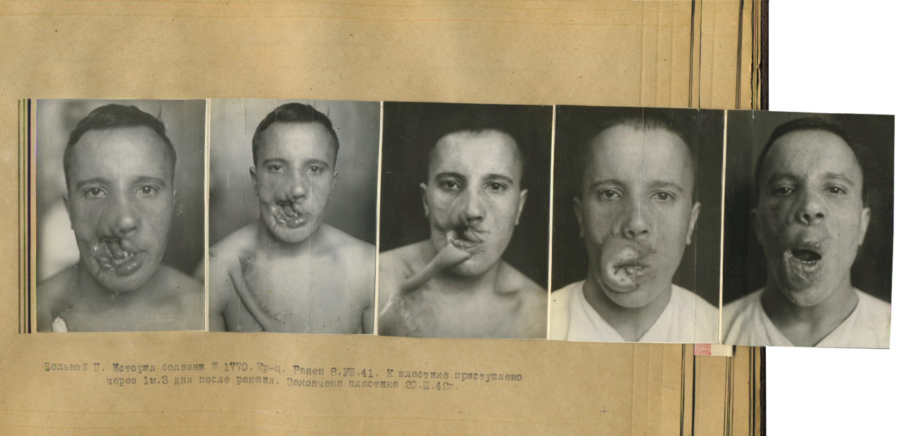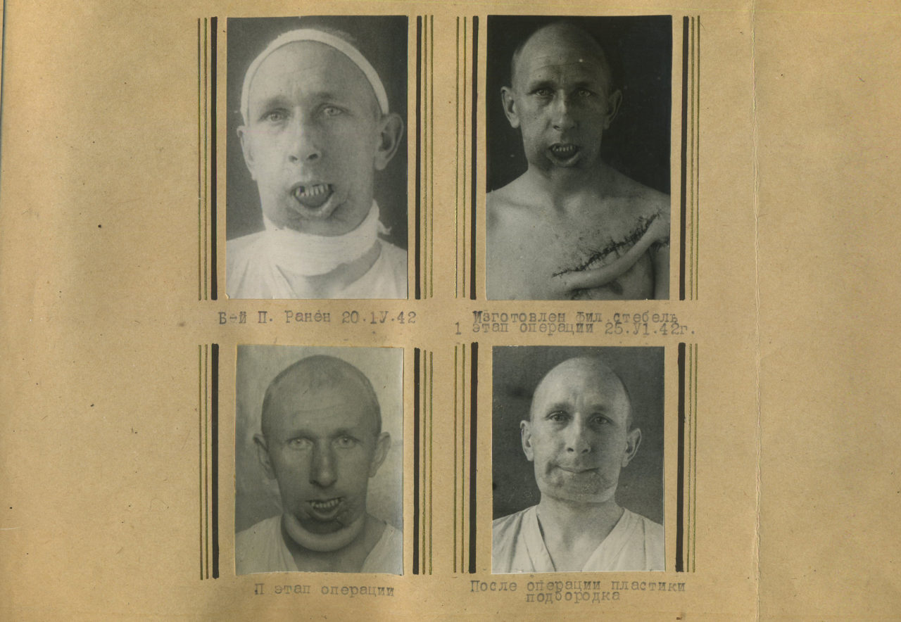 Механотерапия. Гимнастические упражнения перед зеркаломФото: архив Но характер и масштабы лицевых травм, которые получали бойцы Красной армии в годы Великой Отечественной войны, можно оценить, если открыть советские медицинские пособия 40-х годов, предназначенные для узкого круга специалистов. «Обширные рваные, развороченные раны, мелкооскольчатые переломы костей, отрывы отдельных частей лица: носа, ушей, глаз, подбородка <…> нередко приходилось наблюдать и одновременные отрывы верхней и нижней челюстей с отрывом носа, щек, губ и глаз <…> обширные ожоги лица II, III и даже IV степени — такова картина современных военных повреждений лица», — писал в 1947 году профессор Михельсон, заведовавший хирургическим отделением еще в Первую мировую.