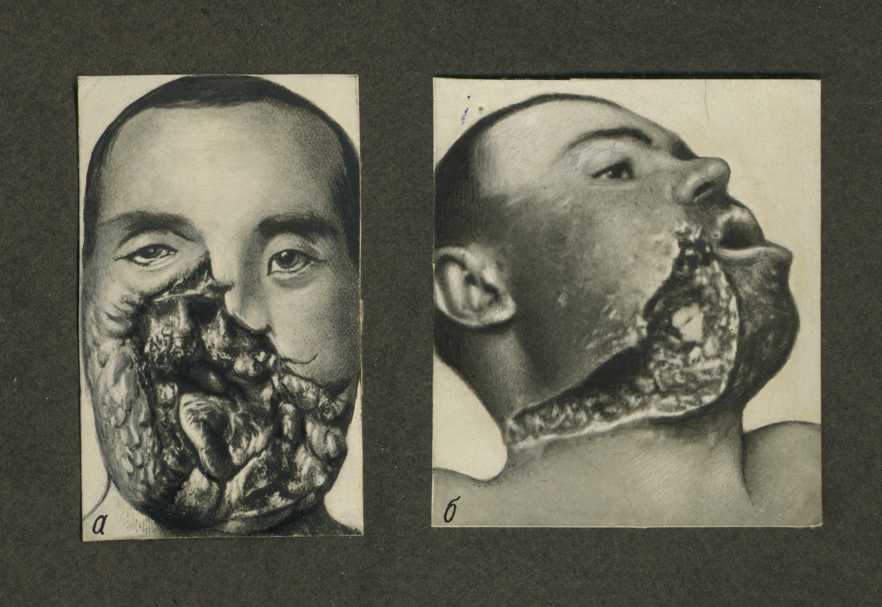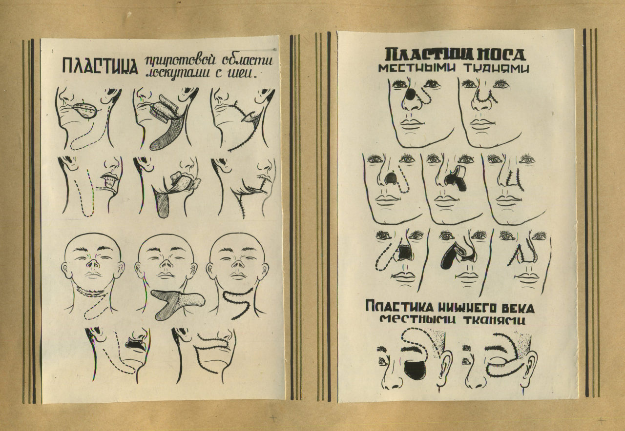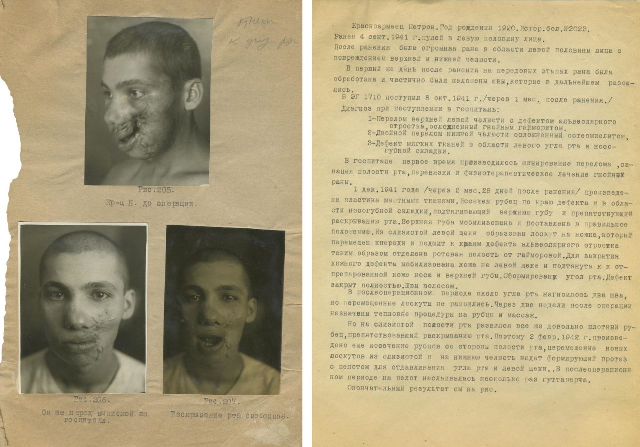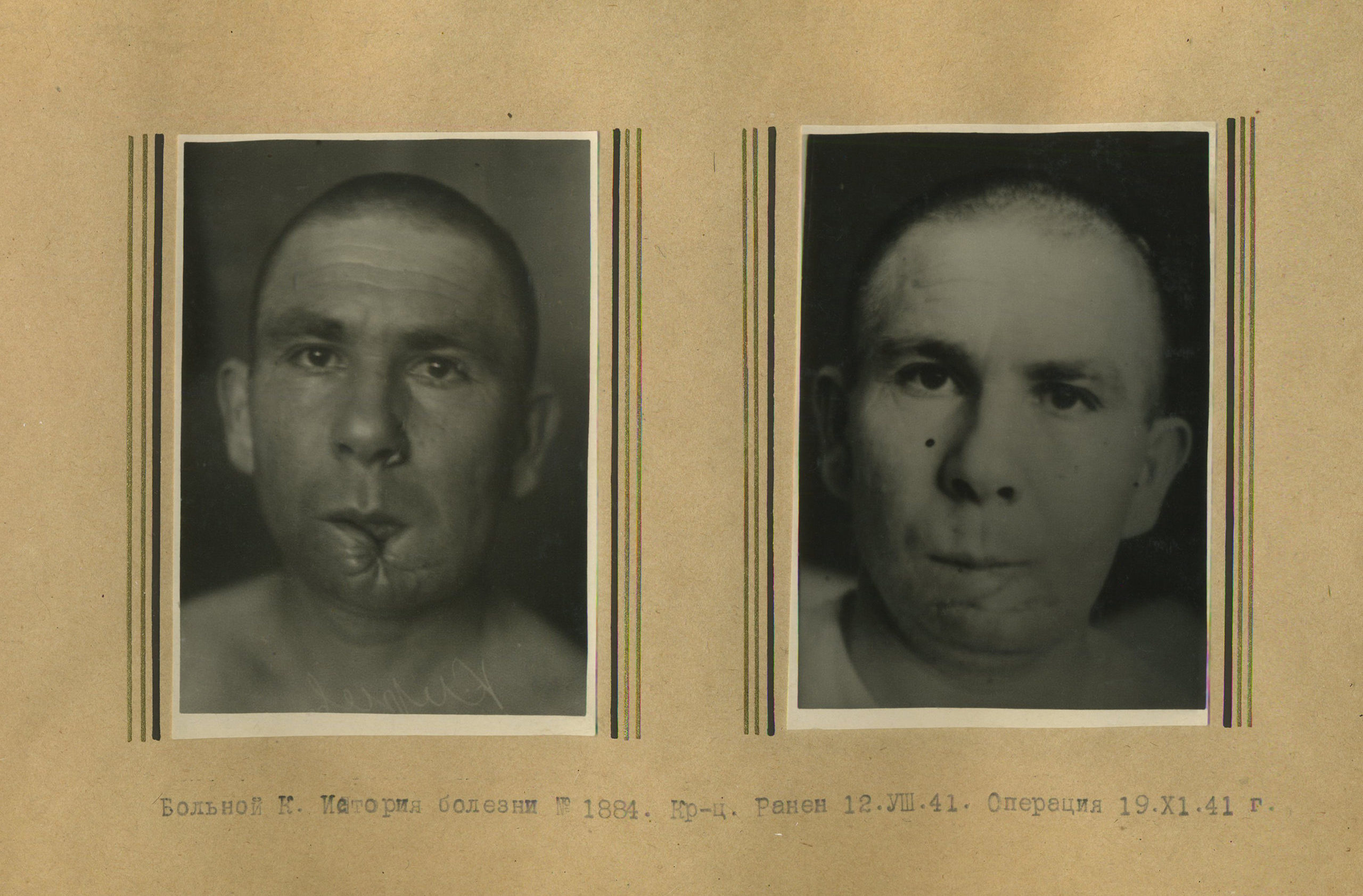 Механотерапия. Гимнастические упражнения перед зеркаломФото: архив Но характер и масштабы лицевых травм, которые получали бойцы Красной армии в годы Великой Отечественной войны, можно оценить, если открыть советские медицинские пособия 40-х годов, предназначенные для узкого круга специалистов. «Обширные рваные, развороченные раны, мелкооскольчатые переломы костей, отрывы отдельных частей лица: носа, ушей, глаз, подбородка <…> нередко приходилось наблюдать и одновременные отрывы верхней и нижней челюстей с отрывом носа, щек, губ и глаз <…> обширные ожоги лица II, III и даже IV степени — такова картина современных военных повреждений лица», — писал в 1947 году профессор Михельсон, заведовавший хирургическим отделением еще в Первую мировую.