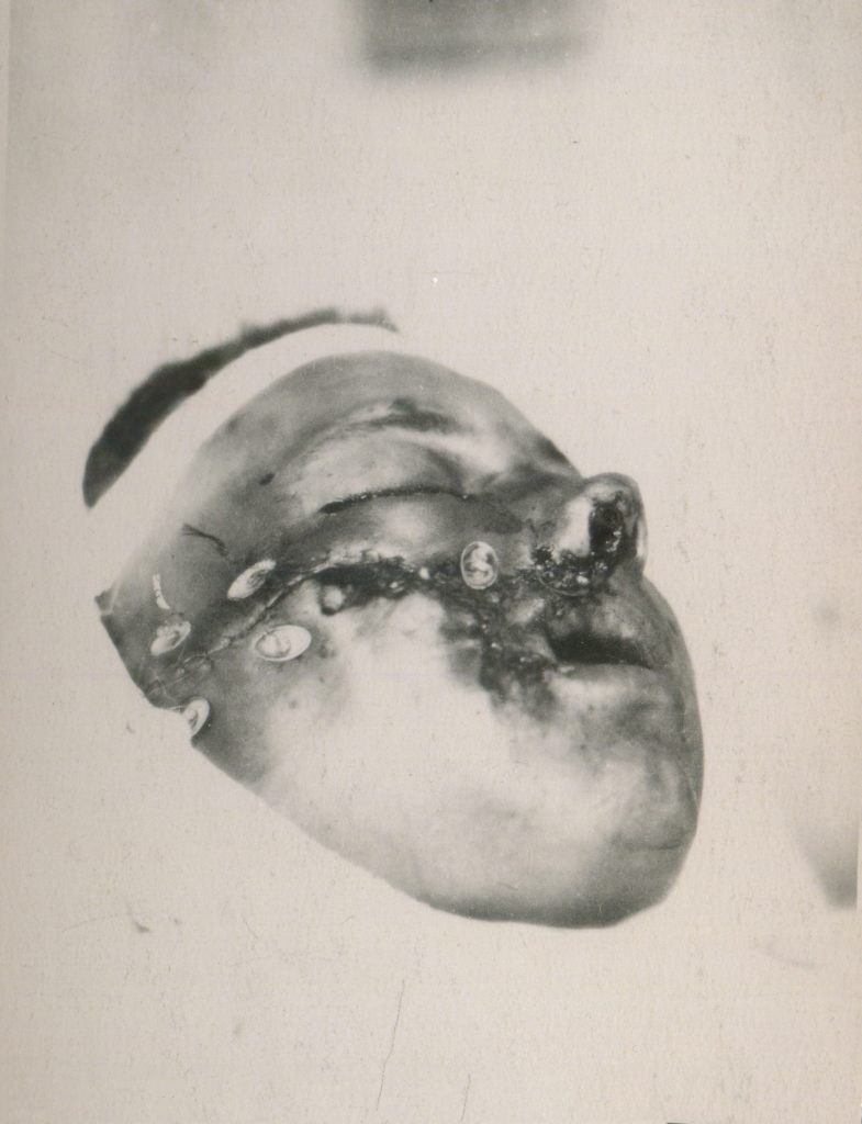 Больной П., ранен 8 августа 1941 года. Устранение дефекта ротовой области с помощью пластики стебельчатым лоскутом ФилатоваФото: архив Стебельчатый лоскут, предложенный В. Филатовым, существовал как метод еще с 1916 года, его использовали вплоть до конца ХХ века, и в военные годы его широко применяли. На теле (обычно в таком месте, где имеется достаточно пластического материала и кожа в наибольшей степени соответствует коже лица, например на животе или внутренней поверхности плеча) формировали кожно-жировой трансплантат — стебель — а потом его пересаживали на место дефекта. В случае если стебель был приготовлен вдали от травмы (например, на животе), к лицу его переносили через руку, то есть сначала приживляя на кисть, а затем уже в нужное место.