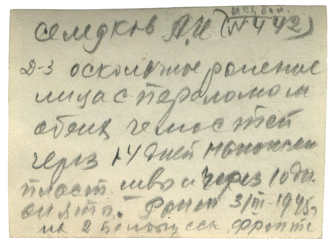 Подпись на обратной стороне фотографии бойца, раненного 3 марта 1945 годаФото: архив Не было раньше таких травм. Автоматы, пулеметы, авиационные оскольчатые снаряды, зажигательные смеси все изменили. А раненым нужно было возвращаться на фронт как можно скорее.