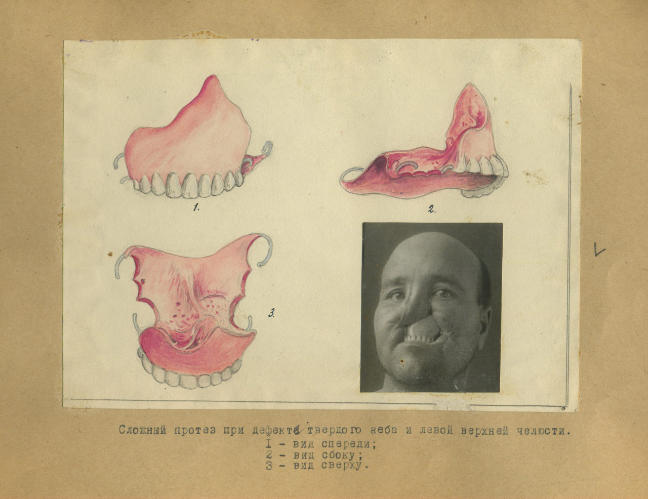 Сложный протез при дефекте твердого нёба и левой верхней челюсти в трех проекциях и на больномФото: архив Уже в начале Великой Отечественной войны в тылу организовали специализированные госпитали для челюстно-лицевых раненых, ввели должности фронтовых и армейских стоматологов. Многие методы и взгляды продолжали пересматривать и совершенствовать.