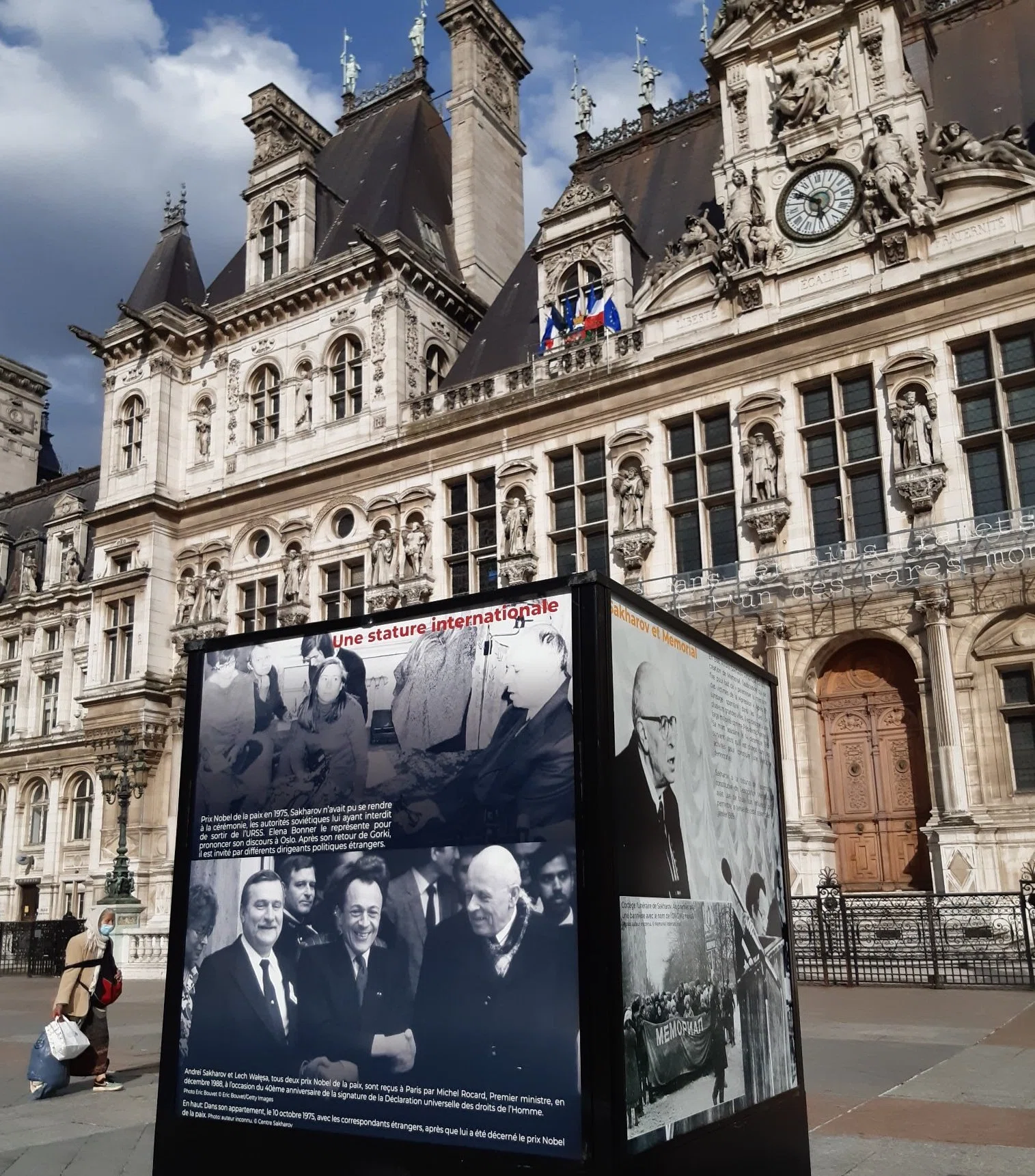 В Париже перед мэрией города открылась выставка, посвященная столетию со дня рождения Андрея Сахарова. Ее организовало французское отделение Международного Мемориала* Memorial France. Экспозиция разделена на две части. Одна из них — это рассказ о самом Андрее Дмитриевиче Сахарове, о его жизни и его борьбе за права человека — с редкими фотографиями и отрывками из воспоминаний современников. Вторая часть посвящена премии имени Сахарова.