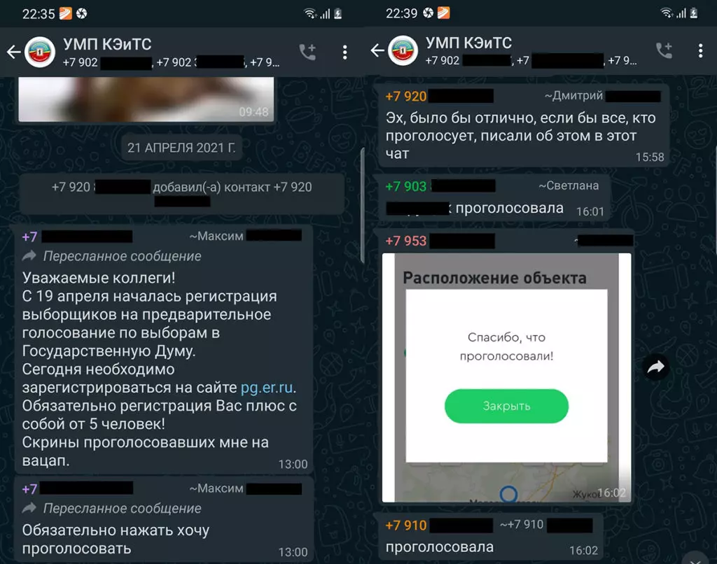 В Малоярославце к голосованию принуждают сотрудников предприятия «Коммунальные электрические и тепловые сети» (УПМ «КЭ и ТС»), а также сотрудников «Водоканала», воспитателей в детских садах и некоторых других бюджетников. Кроме того, судя по скриншотам рабочих чатов, оказавшихся в распоряжении «МБХ медиа», от сотрудников УПМ «КЭ и ТС» требуют уговорить участвовать в голосовании еще пять человек.