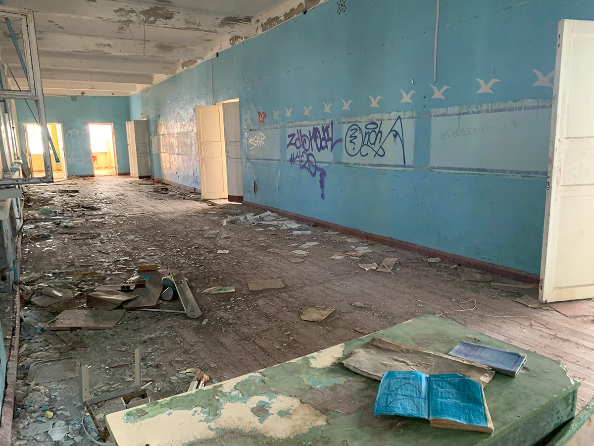 По рекреациям гуляет сквозняк, по полу разбросаны учебники и тетрадки, на стенах и окнах — граффити, оставленные приезжими: «Россия — это край чудес, родился в ней и в ней исчез».
