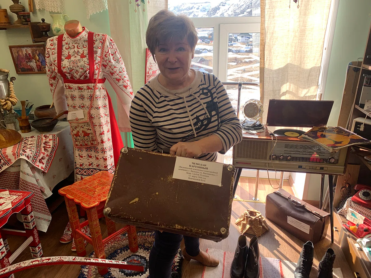 «Вчера из дома выйти не могла: поставили палатку у самого крыльца. Палатка стоит, машины стоят — из подъезда не выйти», — Екатерина Ивановна вроде и не хочет злиться на приезжих, а как тут не злиться? Она работает в ДК, и это самое живое в селе место: сюда приходят петь в хоре, сюда приводят детей. Екатерина Ивановна здесь собирает териберский музей: несколько кабинетов в ДК отданы под экспозицию, которую она продолжает пополнять. Здесь все: от старых фото, на которых видна сельская церковь (местные разобрали ее на дрова), до разномастных поделок, от 100-летней прялки до фанерного чемоданчика, с которым сама Екатерина Ивановна девочкой ездила в пионерлагерь.