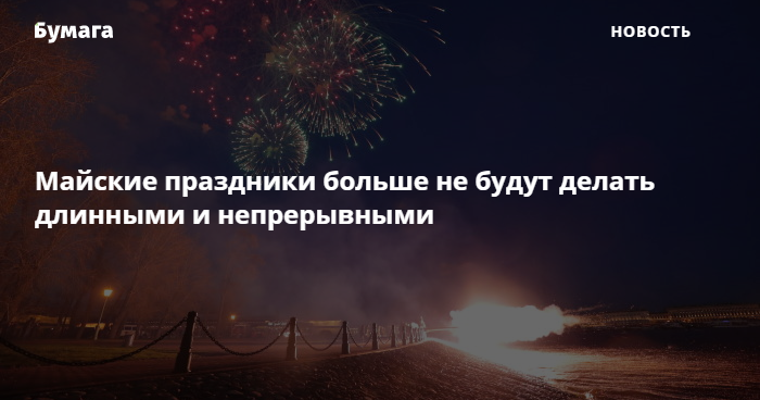 В будущем российские власти не планируют делать майские праздники длинными и непрерывными, сообщает «РИА Новости» со ссылкой на главу Минтруда Антона Котякова.
