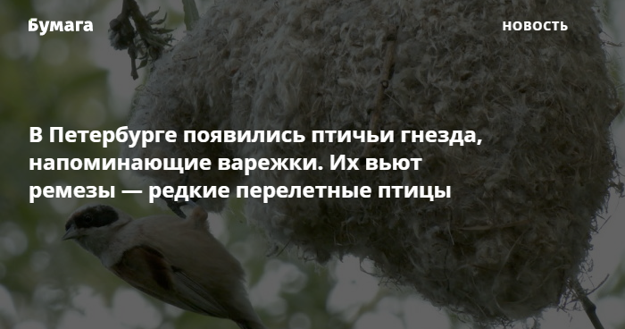 На деревьях в Петербурге можно увидеть необычные гнезда, по форме напоминающие варежки без большого пальца. Их вьют перелетные птицы ремезы, рассказал биолог Павел Глазков, автор паблика «Каждой твари по паре».