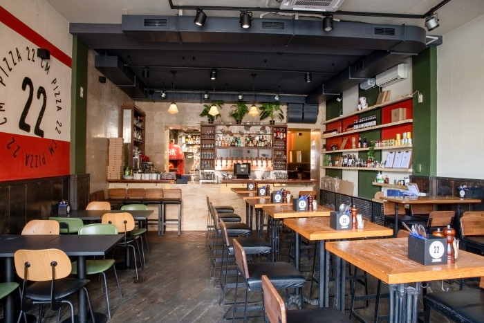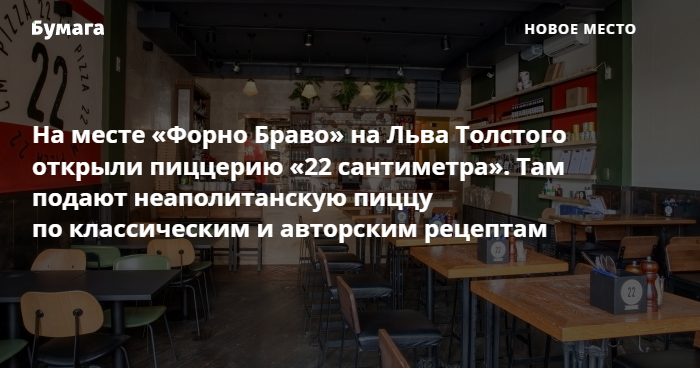 В апреле на месте ресторана «Форно Браво» на улице Льва Толстого, 1-3 начала работу пиццерия «22 сантиметра», рассказали «Бумаге» создатели проекта. Почти месяц заведение работало в техническом режиме, все ремонтные работы завершили к майским праздникам.