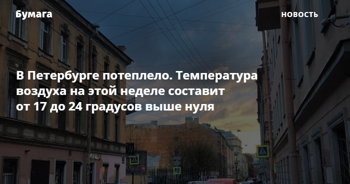 По данным Гидрометцентра, температура воздуха на этой неделе не опустится ниже 17 градусов тепла, а во вторник и среду воздух в Петербурге прогреется до 22-24 градусов.