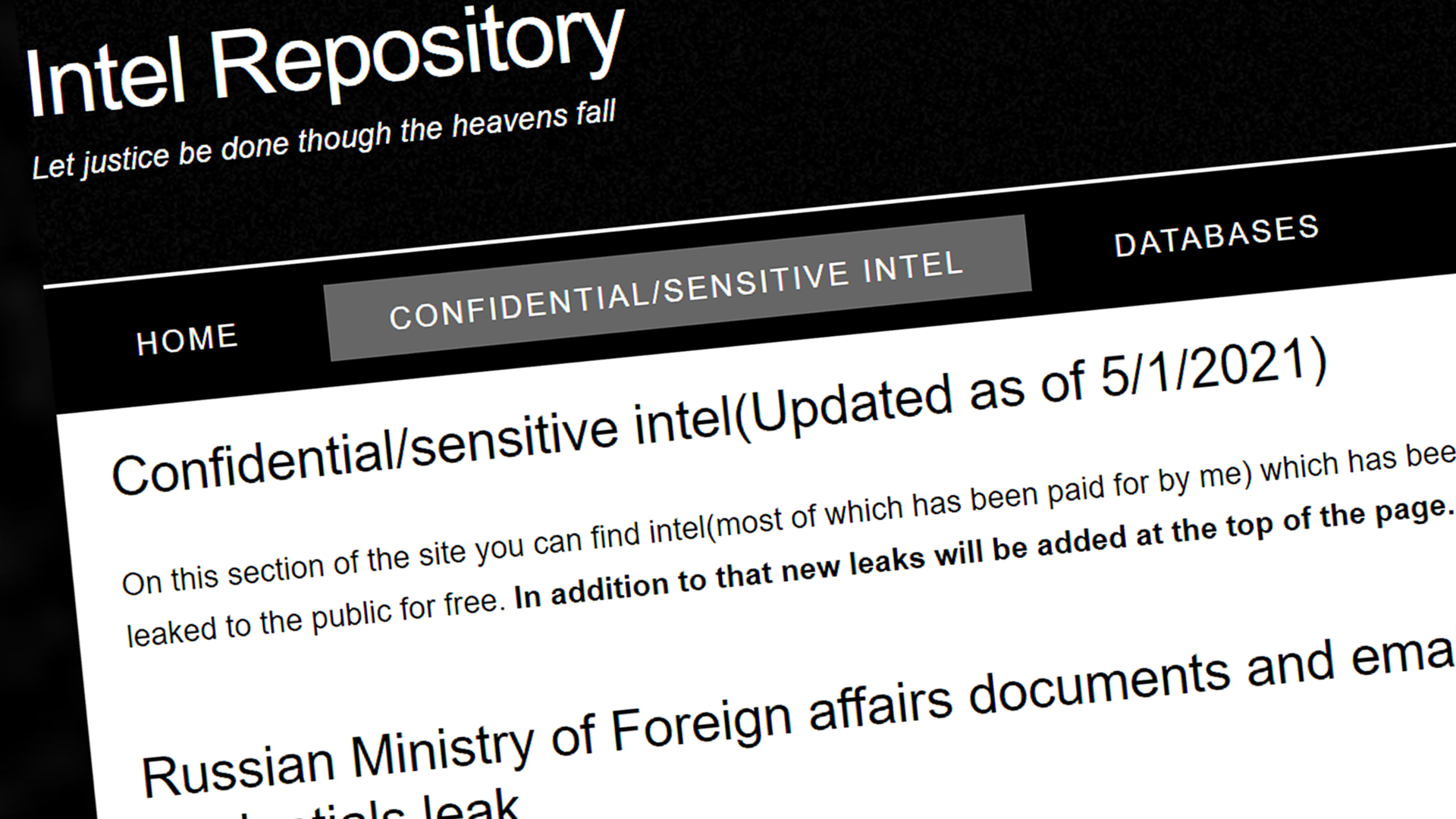 В конце апреля 2021 года Министерство иностранных дел России подверглось кибератаке: анонимы похитили паспортные данные сотрудников, отчеты о работе, инструкции для переговоров и другие конфиденциальные документы. Вскоре этот архив появился на площадке Intel Repository ("Развед-репозиторий") в даркнете. Ее создатель под псевдонимом Spectre прокомментировал публикацию телеканалу Настоящее Время: "Коррумпированное российское правительство однажды падет. Борьба за то, чтобы этот день наступил как можно скорее, идет прямо сейчас, и я хочу быть ее частью".