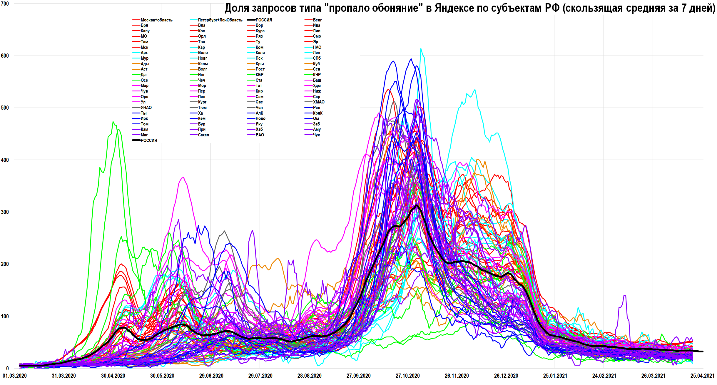 Я пользуюсь статистикой поисковых запросов в Яндексе, смотрю долю коронавирусных запросов "пропало обоняние" по времени в разных регионах. К сожалению, по этому показателю нельзя сравнивать Чечню с какой-нибудь условной Тамбовской областью, потому что этнический состав населения другой, другое владением языками, проникновение интернета, пользовательские привычки поиска и так далее. Но один и тот же регион можно отслеживать за разные периоды времени, то есть можно оценить динамику. Если мы эту статистику по запросам сдвигаем на месяц вперёд, грубо говоря, то мы получаем с хорошим совпадением избыточную смертность по каждому конкретному региону.