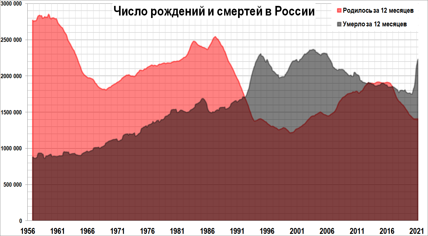 – Оперативные данные по дате регистрации говорят, что декабрь был самым плохим месяцем. Прирост числа смертей к такому же месяцу годом ранее достиг +63%, то есть плюс 94 тысячи смертей. Уже ноябрь поставил абсолютный рекорд по числу умерших за всю историю страны (220 тысяч умерших), если не считать ВОВ. Но декабрь его превзошёл: умерли 243 тысячи человек. У нас никогда раньше в мирное время столько людей не умирало.