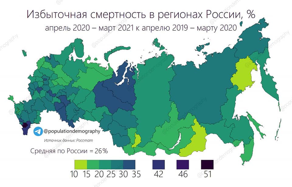 Даже в благополучной стране, у которой потихонечку растет продолжительность жизни и население раньше быстро росло, а сейчас стареет, каждый год будут биться рекорды по абсолютному числу умерших. Это понятно, и в этом нет никакой катастрофы. Но у нас в пандемию случился резкий всплеск смертности, он и на графике замечательно виден. Сейчас избыточная смертность в 4–5 раз меньше, чем была в декабре и ноябре. Я думаю, что на самом деле в ноябре умерло примерно столько же, сколько в декабре, или даже немного больше, но данных для поверки этого у нас пока нет. Но уже в январе началось быстрое снижение избыточной смертности – плюс 56 тысяч, или плюс 34%. Позитивная тенденция продолжилась в феврале – плюс 29 тысяч, то есть плюс 21%. За два месяца избыточная смертность снизилась втрое. И по идее, в марте должно было быть еще меньше, где-то плюс 15%, то есть примерно плюс 24 тысячи, но из-за производственного календаря ЗАГСов, когда рабочих дней было больше, чем в прошлом году (22 против 19), получилось увеличение числа умерших по сравнению с прошлым мартом на 38,5 тысяч человек, или на 26%. Но нельзя судить по этим данным о якобы начале нового ухудшения ситуации: мол, в марте смертность снова выше, чем в феврале, пошел рост. Нет, это отчасти фактор производственного календаря, ведь число родившихся вообще выросло на неслыханные 15%. И в апреле я тоже не вижу никаких предпосылок, чтобы смертность выросла по отношению к марту: например, в Бурятии число умерших увеличилось по сравнению с прошлым апрелем всего на 14%, а в прошлом апреле избыточной смертности в Бурятии ещё не было.