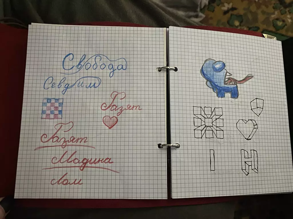 В другой тетрадке — разноцветные рисунки, люди, животные, пейзажи. А на одном из листов слова — Свобода, Севдим (любовь на турецком), Разят, Мадина и Лом. Это имена бабушки, мамы и отца.