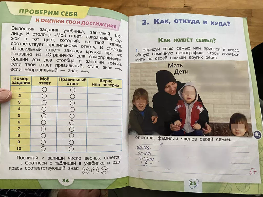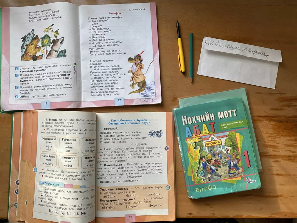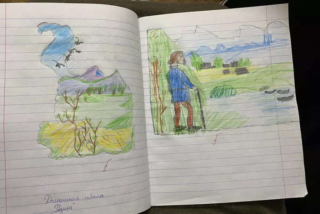 В тетрадках, где должен быть литературный пересказ, каждое второе задание — не текст, а рисунок. Больше всего Амине нравится рассказ Пришвина «Выскочка» — тут она нарисовала собаку у дерева и сороку, обе почему-то синего цвета. Под ее домашними заданиями одни пятерки.